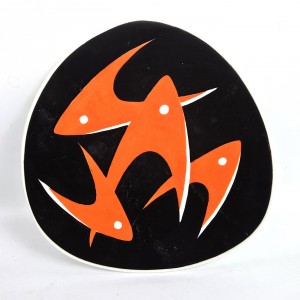 New Look - węgierski design połowy XXw Kolekcjonerski talerz patera Ryby projektant János Török dla Zsolnay Manufactory lata 60te. Modernistyczna trójkątna forma, charakterystyczne obłe kształty, malatura w mocnej czerwono czarnej kolorystce, rysunek a'la picasso. Ręcznie malowana śred.24cm stan bardzo dobry, drobne ślady użytkowania, mini przetarcia
