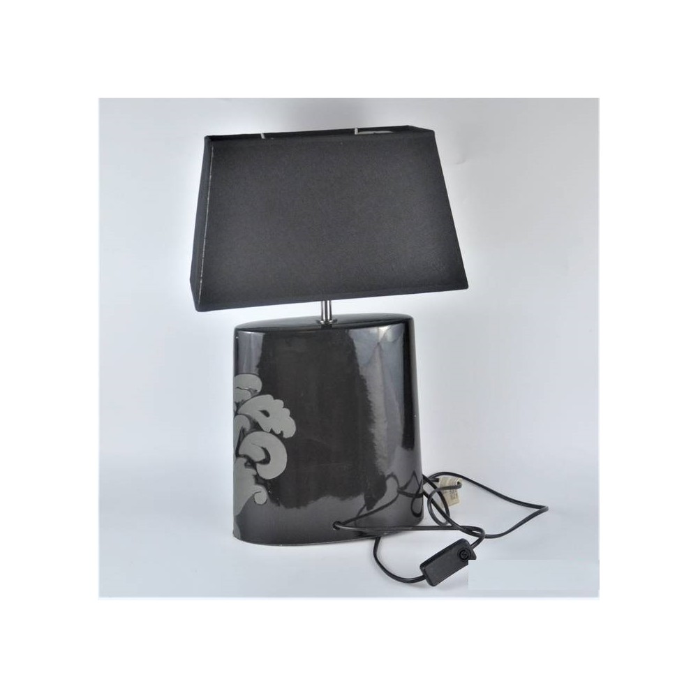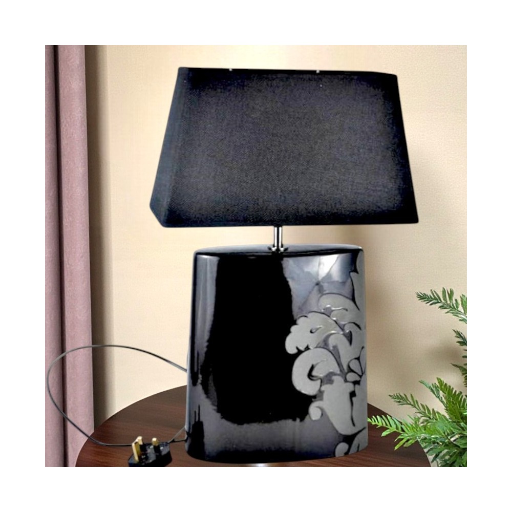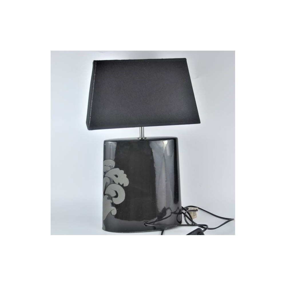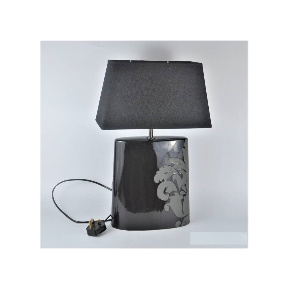 Angielska lampa stołowa firmy Next o niepowtarzalnym kształcie w modnej kolorystyce. Modernistyczna forma, lekko spłaszczona zwężająca się na górze. Podstawa ceramiczna (porcelanowa), czarna z szarą dekoracją roślinną, abażur trapez, czarny .