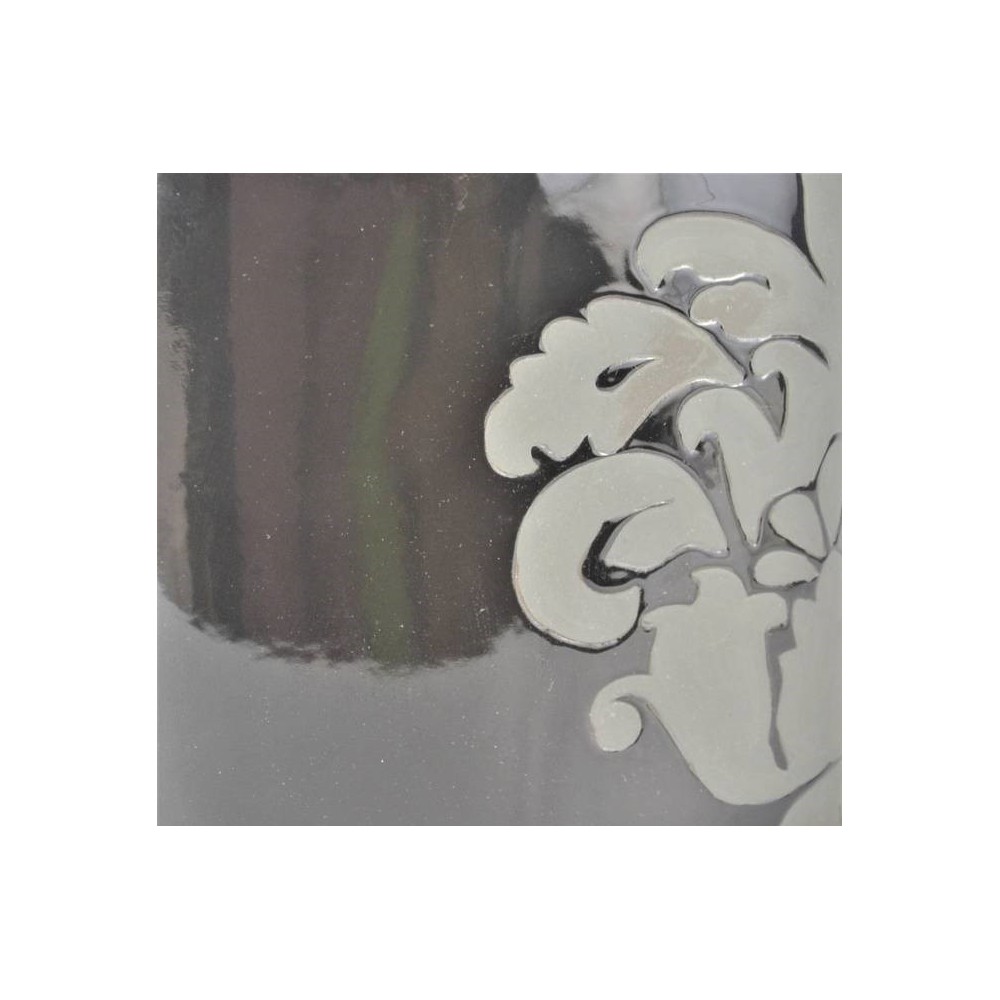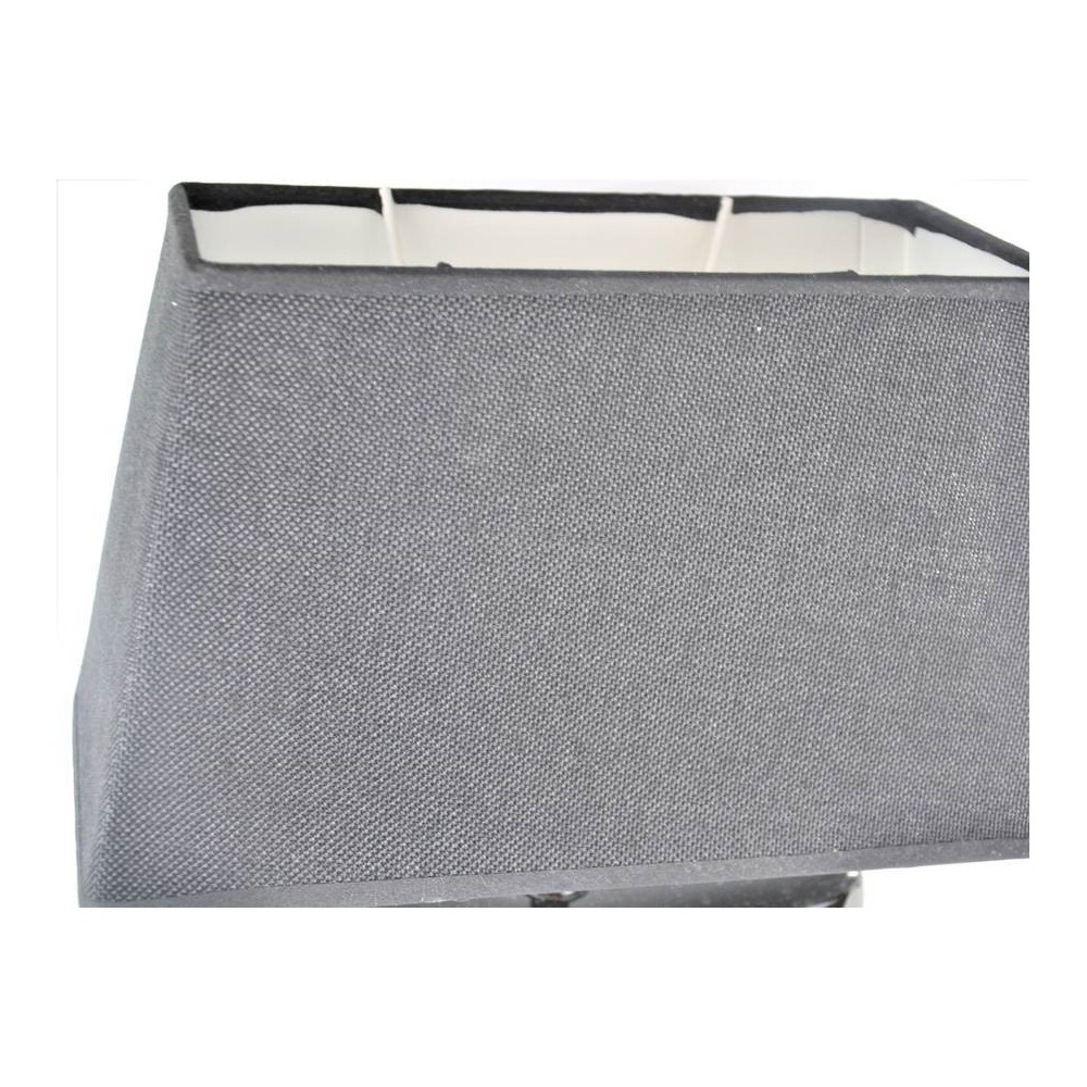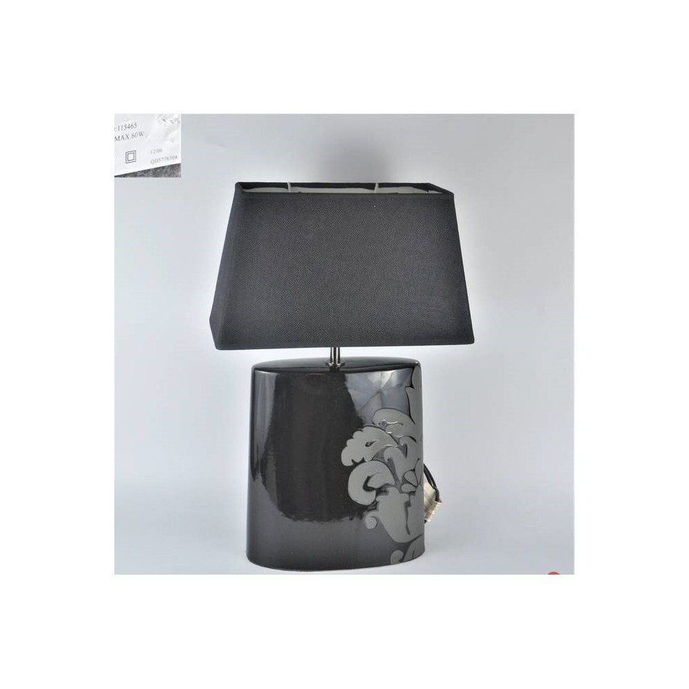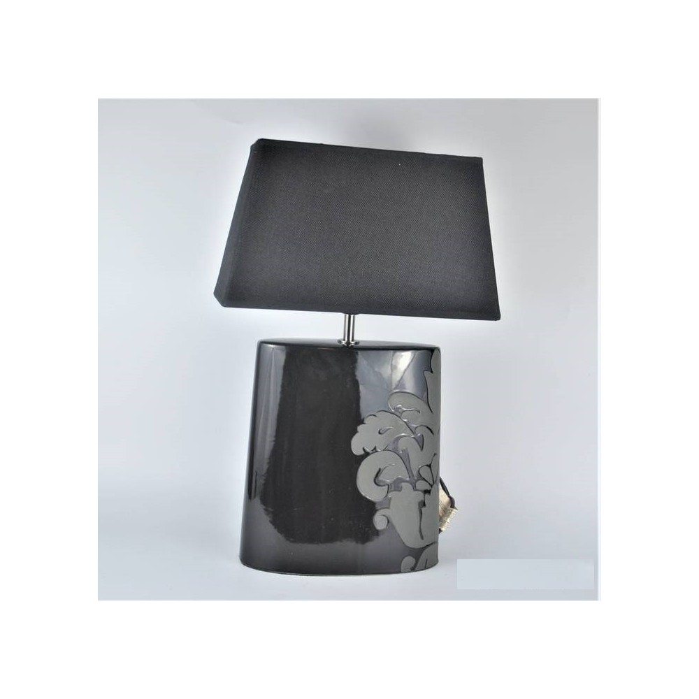 Angielska lampa stołowa firmy Next o niepowtarzalnym kształcie w modnej kolorystyce. Modernistyczna forma, lekko spłaszczona zwężająca się na górze. Podstawa ceramiczna (porcelanowa), czarna z szarą dekoracją roślinną, abażur trapez, czarny .