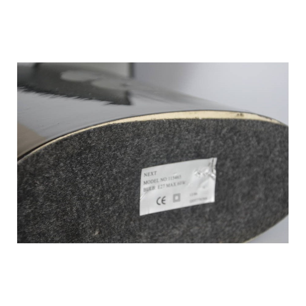 Angielska lampa stołowa firmy Next o niepowtarzalnym kształcie w modnej kolorystyce. Modernistyczna forma, lekko spłaszczona zwężająca się na górze. Podstawa ceramiczna (porcelanowa), czarna z szarą dekoracją roślinną, abażur trapez, czarny doskonale dopasowany kształtem i fakturą tkaniny. Lampa z 2006r prezentuje się wyjątkowo, jest w bardzo ładnym stanie, abażur nowy, wtyczka angielska (dodam przejściówkę w gratisie). Wysokość całkowita 48cm, podstawa 23,5/10cm