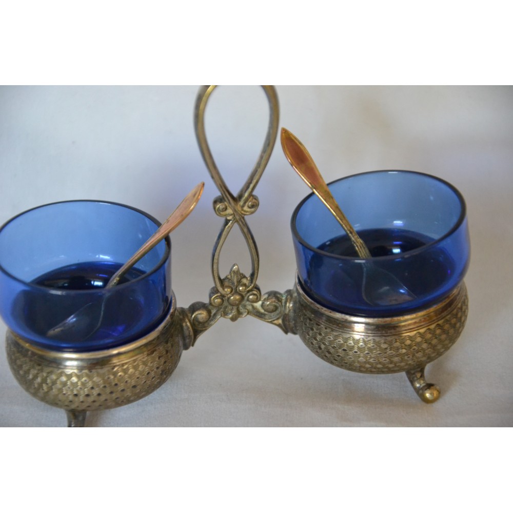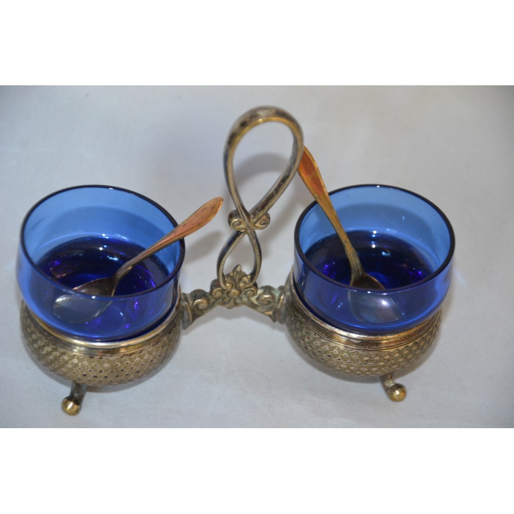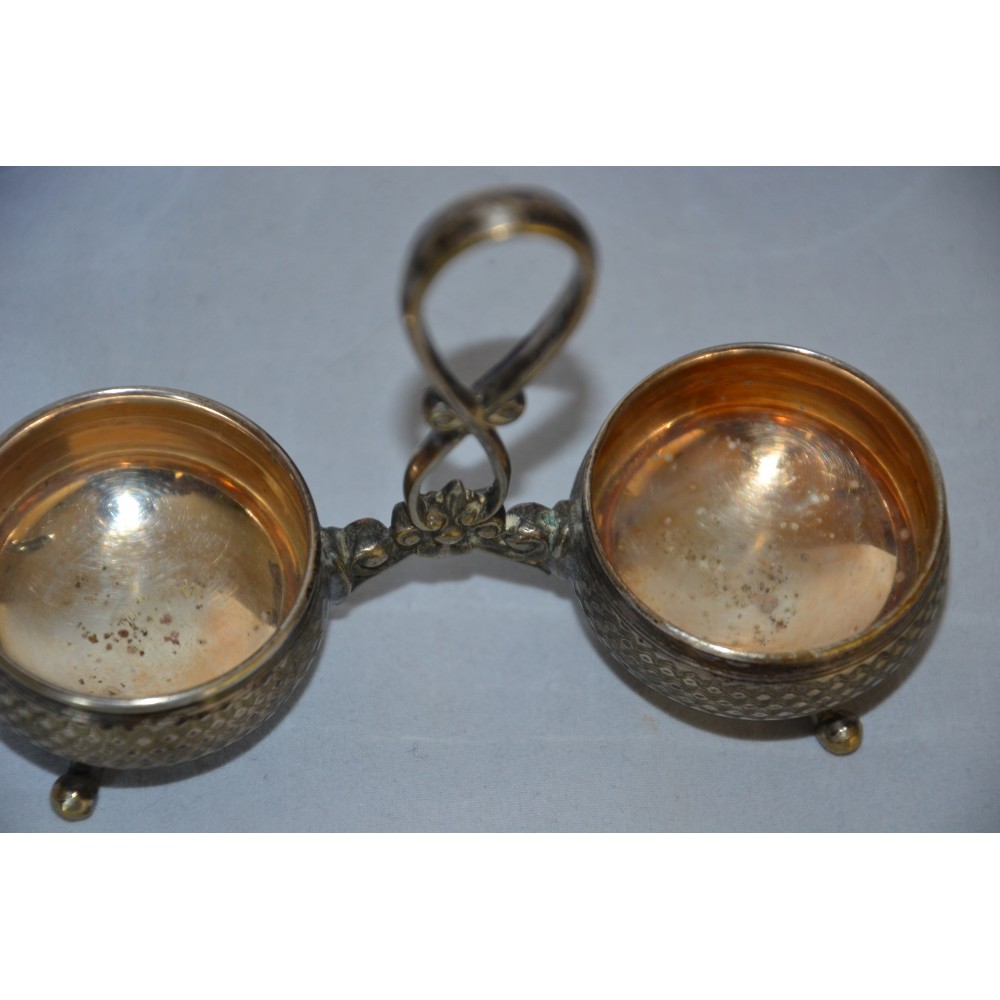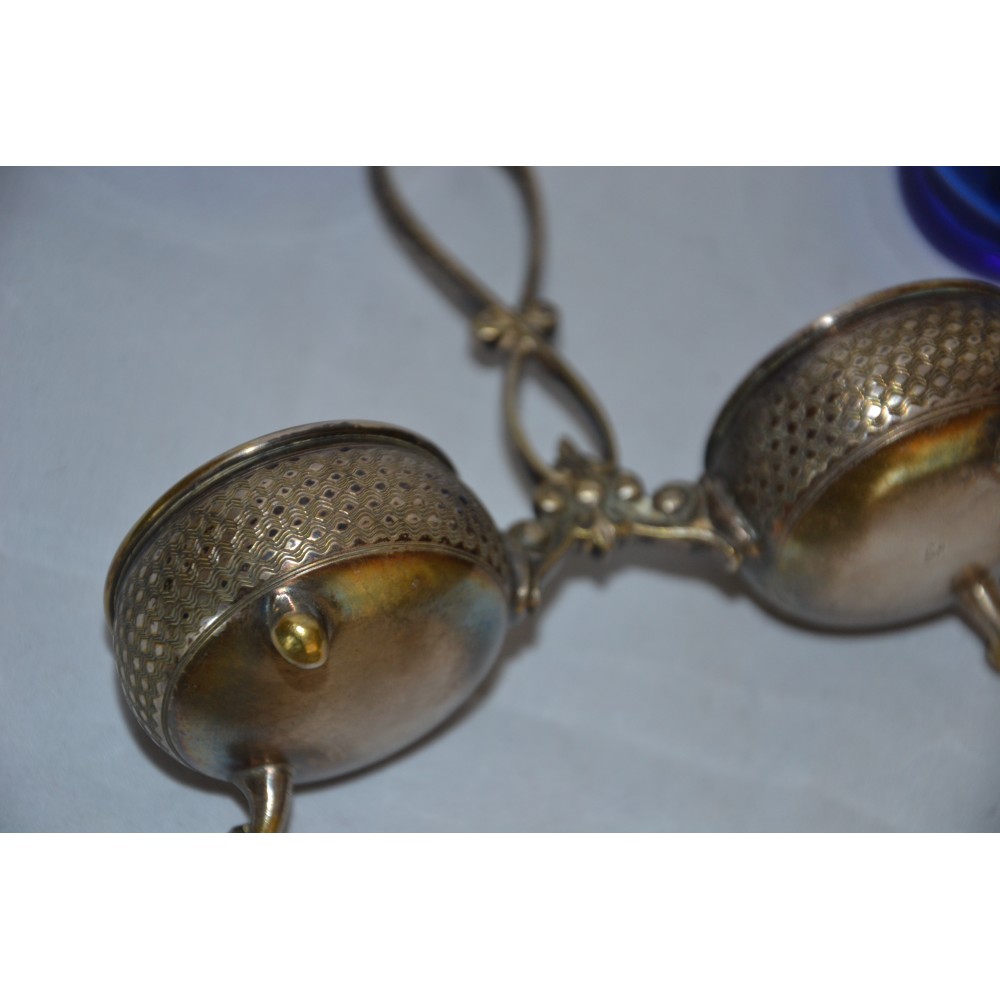 Przedmiotem sprzedaży jest finezyjny kabaret do przypraw sygnowany znakiem słynnej niemieckiej wytwórni platerów Württembergische Metallwarenfabrik, WMF lata międzywojenne. Bardzo ładny dwukomorowy projekt dwa giloszowane koszyki na wygiętych nóżkach połączone dekoracyjnym uchwytem. W gratisie dokładam dwa szklane wkłady w kolorze kobaltowym i dwie łyżeczki sygnowane GAB. Wymiary :szerokość maksymalnie 13cm, wysokość maksymalnie 10cm szklane wkłady wys.4cm, średnica 4cm stan bardzo dobry, produkt pokryty naturalną patyną nie czyszczony. Nietuzinkowy, utrzymana w eleganckim stylu, wiekowy, światowej marki, doskonały okaz do kolekcji lub dekoracyjny element zastawy, będzie ozdobą stołu, podniesie rangę przyjęcia. Zachęcam do zakupu.