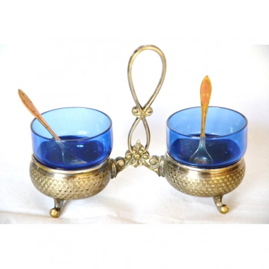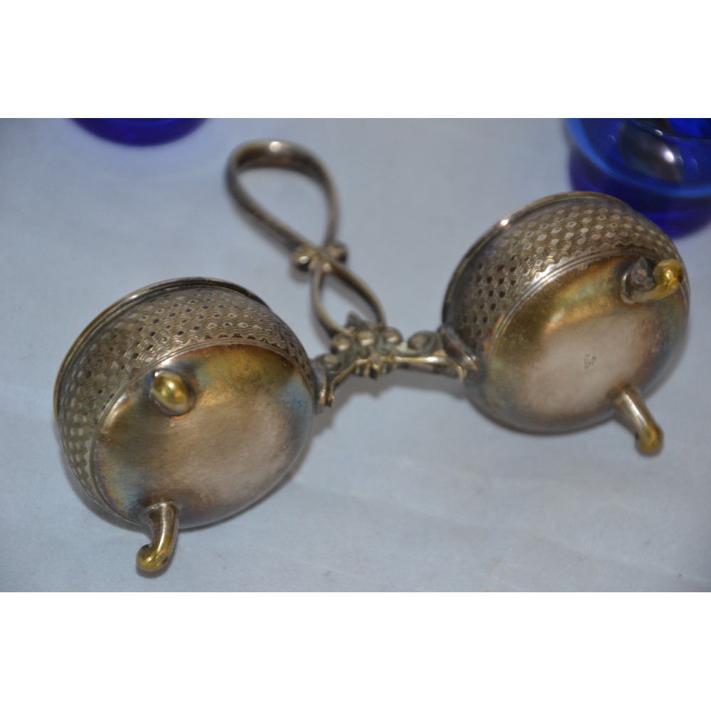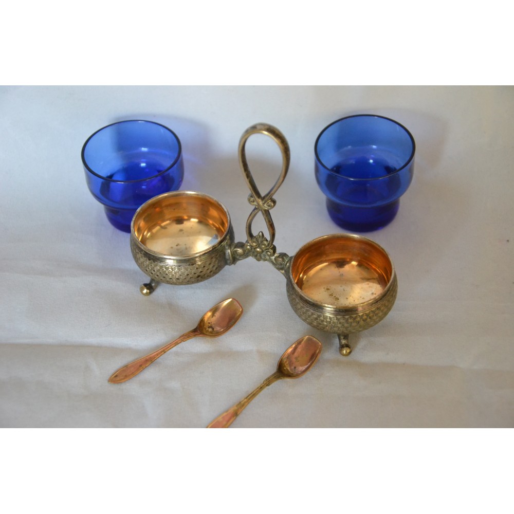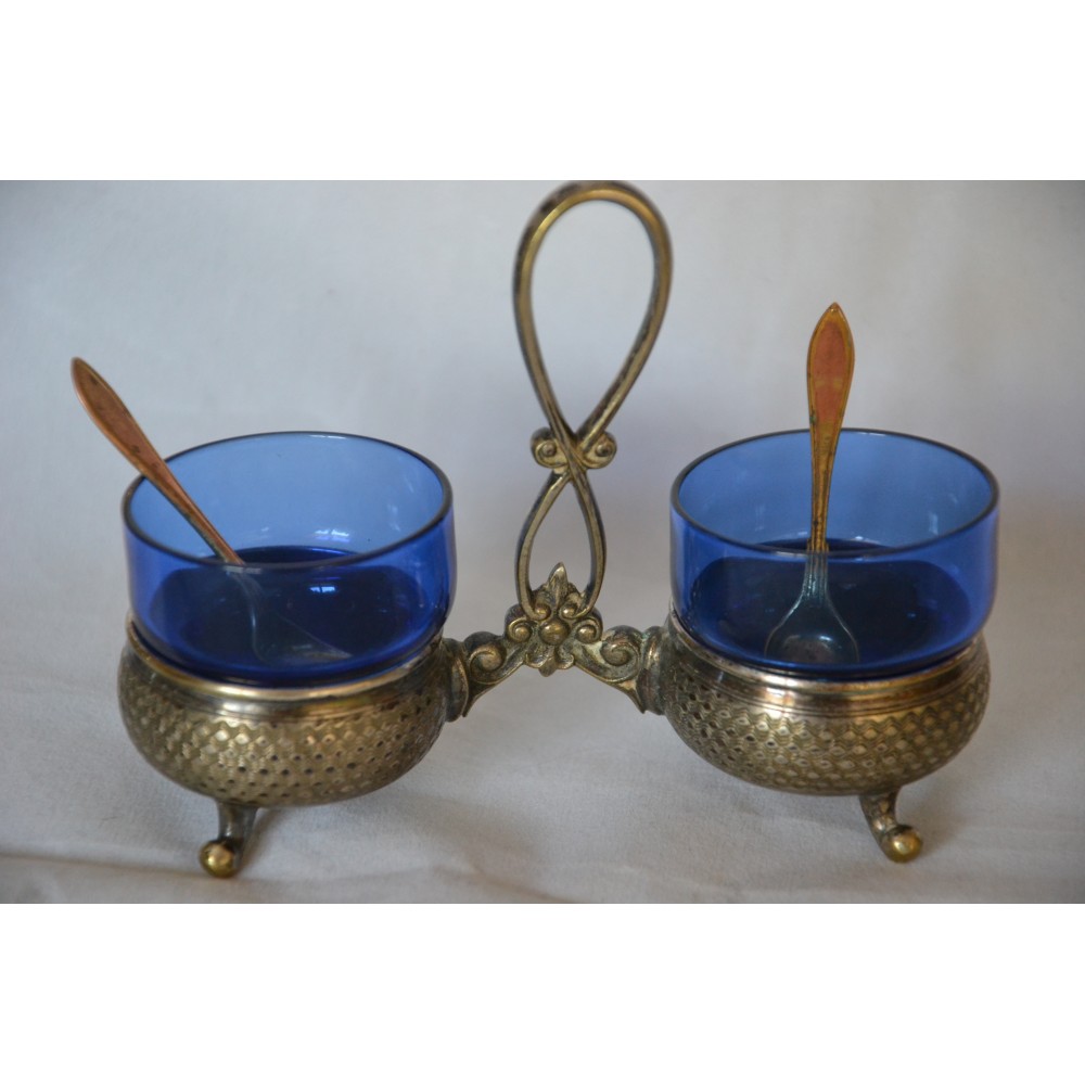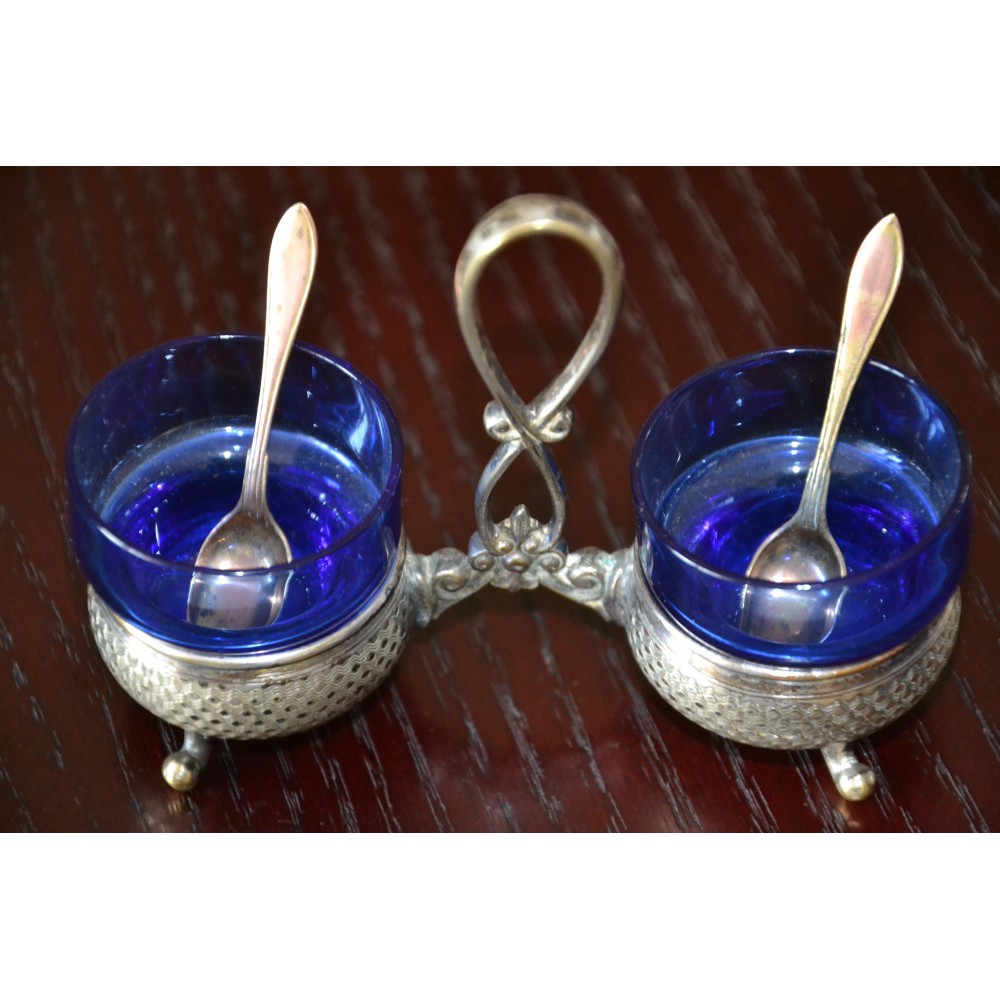 Przedmiotem sprzedaży jest finezyjny kabaret do przypraw sygnowany znakiem słynnej niemieckiej wytwórni platerów Württembergische Metallwarenfabrik, WMF lata międzywojenne. Bardzo ładny dwukomorowy projekt dwa giloszowane koszyki na wygiętych nóżkach połączone dekoracyjnym uchwytem. W gratisie dokładam dwa szklane wkłady w kolorze kobaltowym i dwie łyżeczki sygnowane GAB. Wymiary :szerokość maksymalnie 13cm, wysokość maksymalnie 10cm szklane wkłady wys.4cm, średnica 4cm stan bardzo dobry, produkt pokryty naturalną patyną nie czyszczony. Nietuzinkowy, utrzymana w eleganckim stylu, wiekowy, światowej marki, doskonały okaz do kolekcji lub dekoracyjny element zastawy, będzie ozdobą stołu, podniesie rangę przyjęcia. Zachęcam do zakupu.