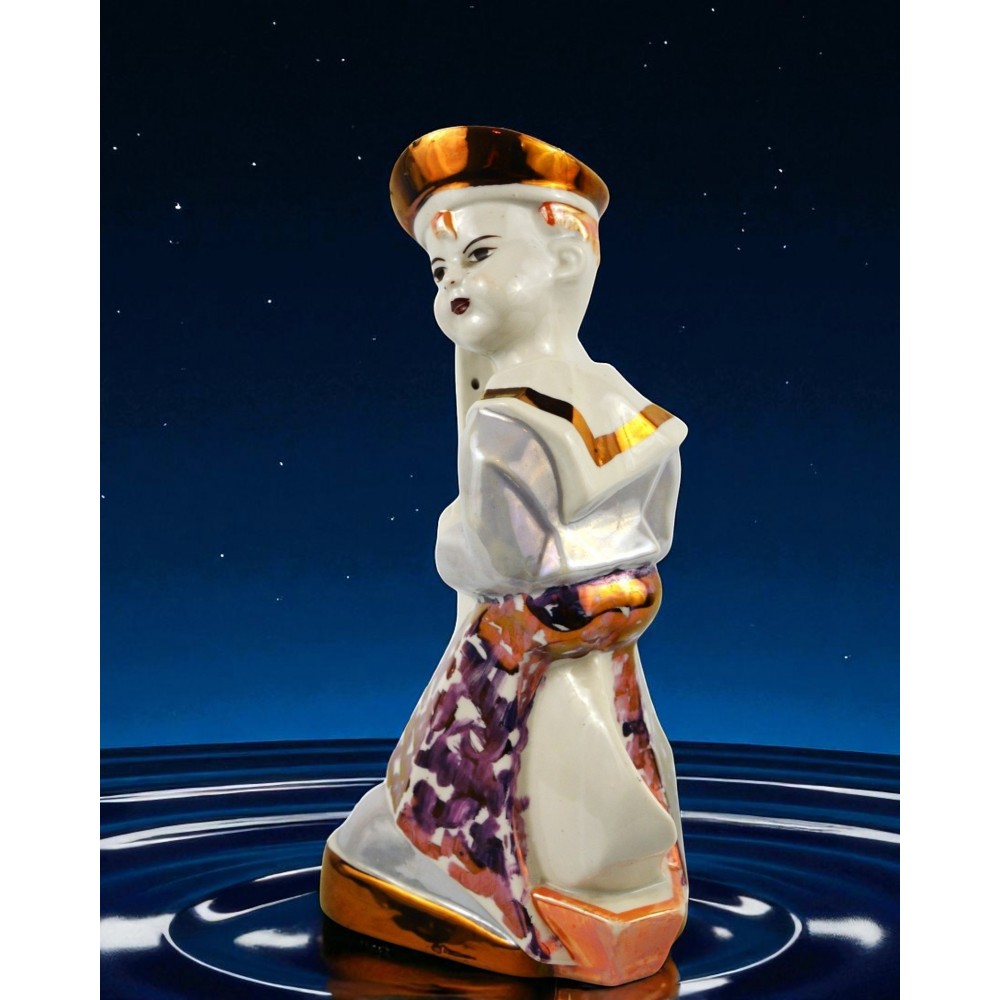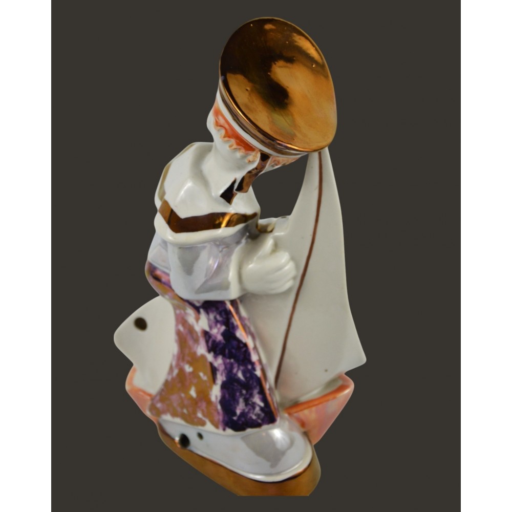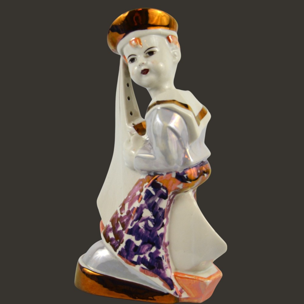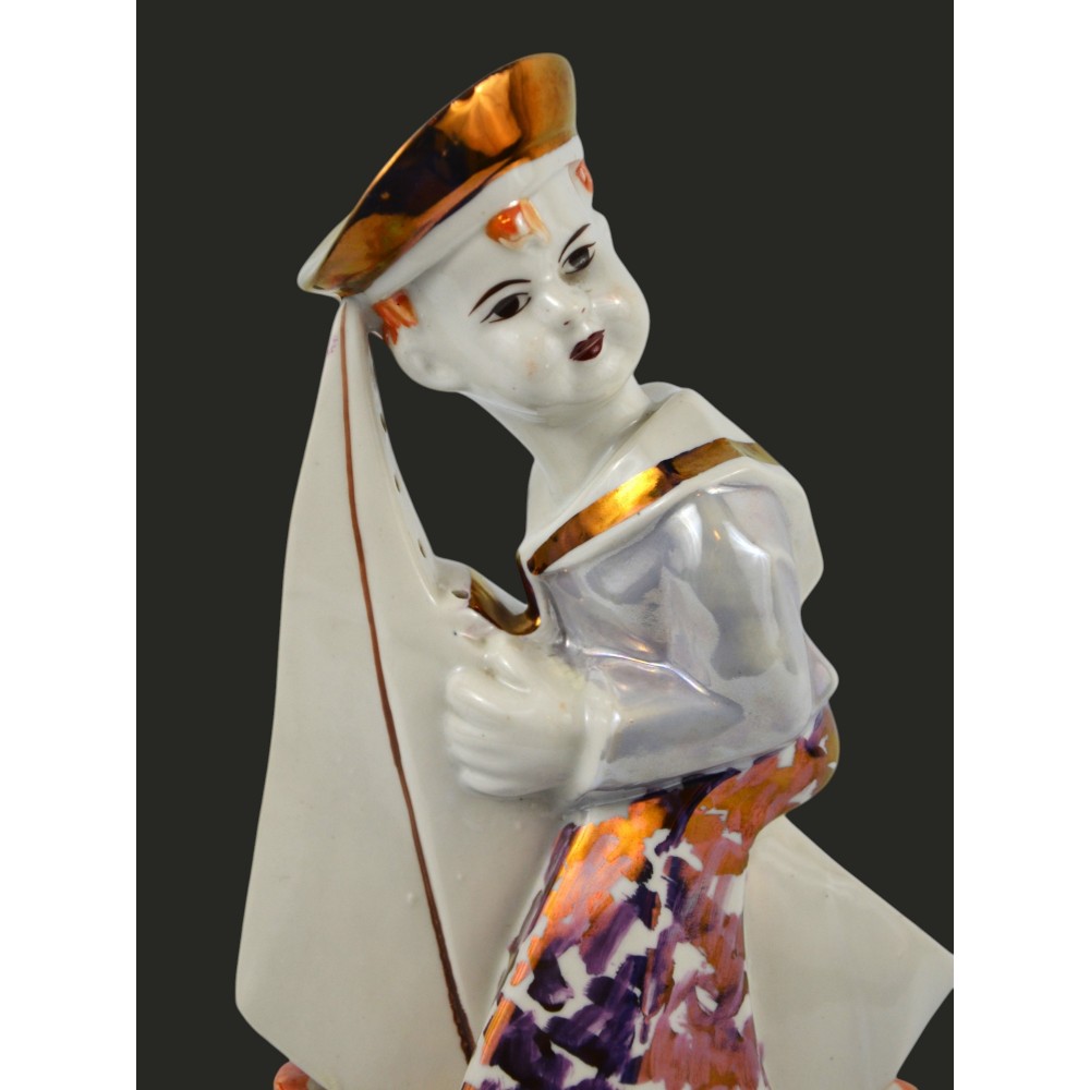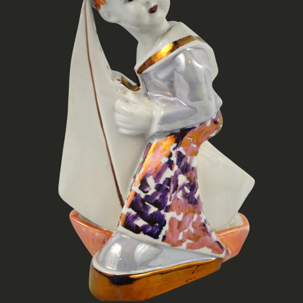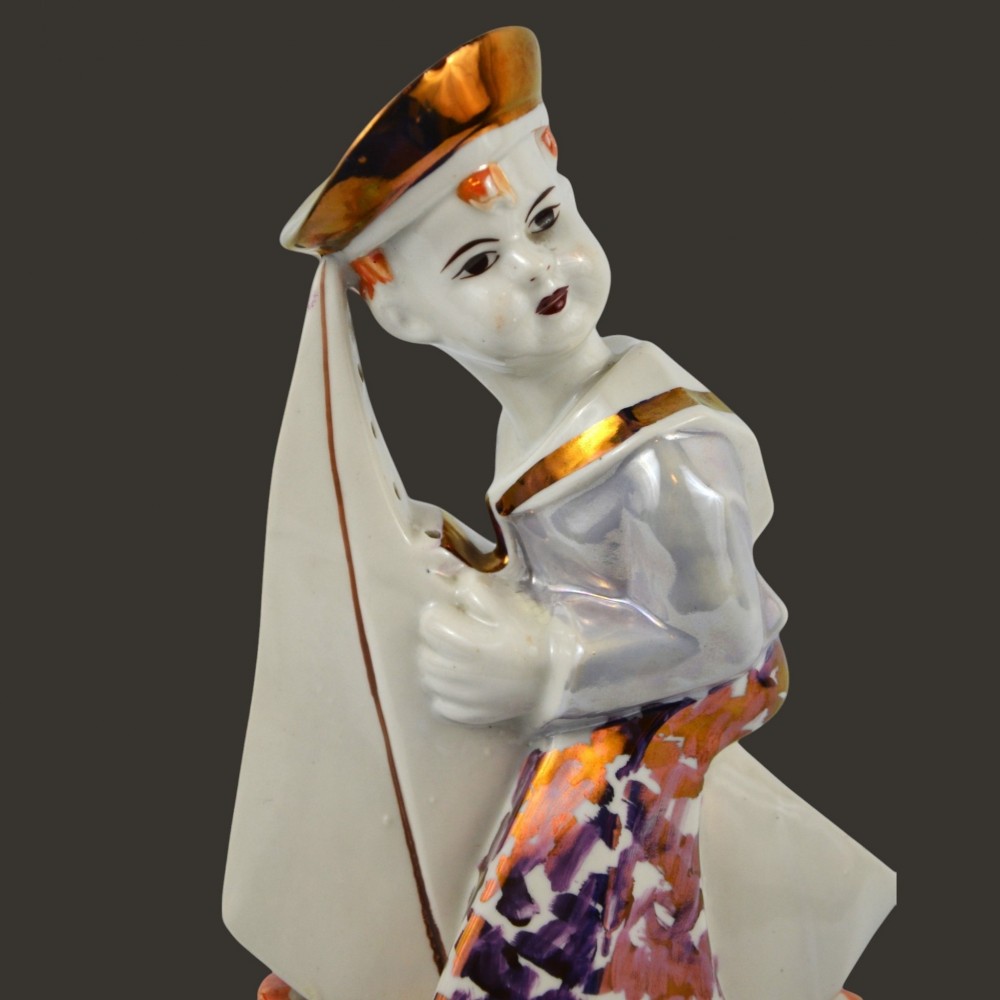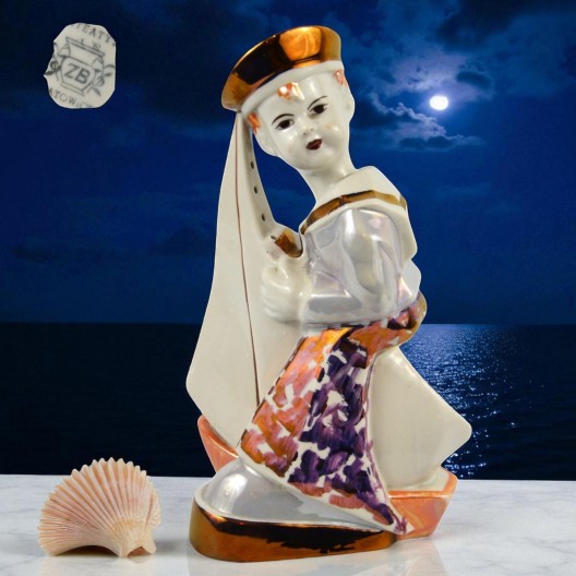 Żeglarz marynarz, pochłaniacz zapachów Steatyt Zygmunt Buksowicz Katowice lata50/60te . Figurka chłopca ubranego w marynarski strój z małą żaglówką między nogami. Na nogach nieproporcjonalnie duże buty o grubej podeszwie. Biała porcelana, dekorowana farbami lustrowymi, ze złotymi akcentami.