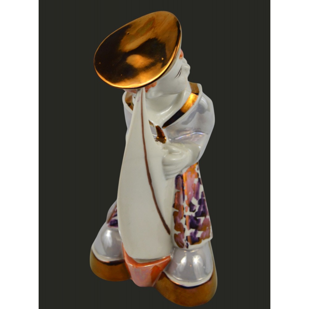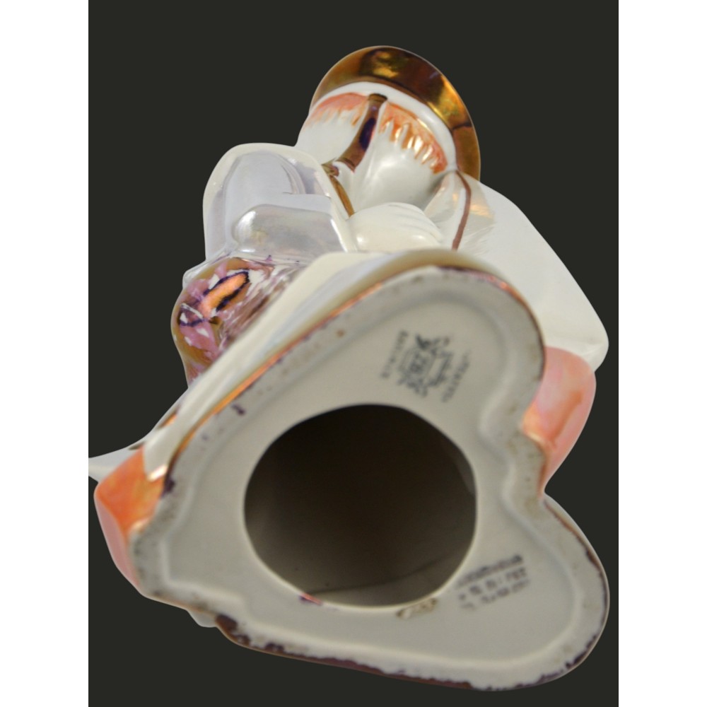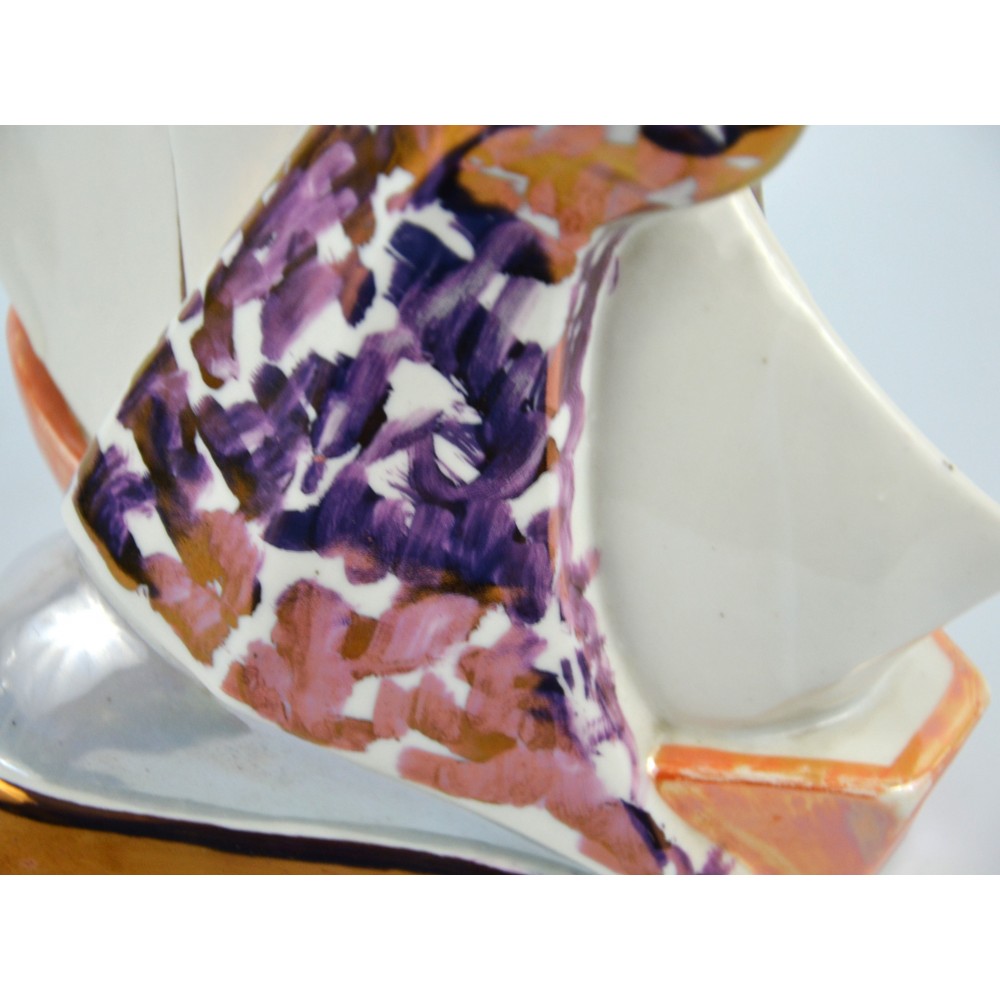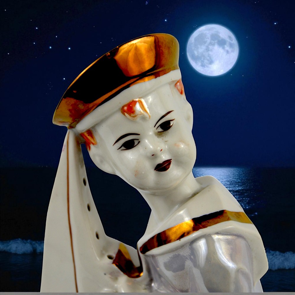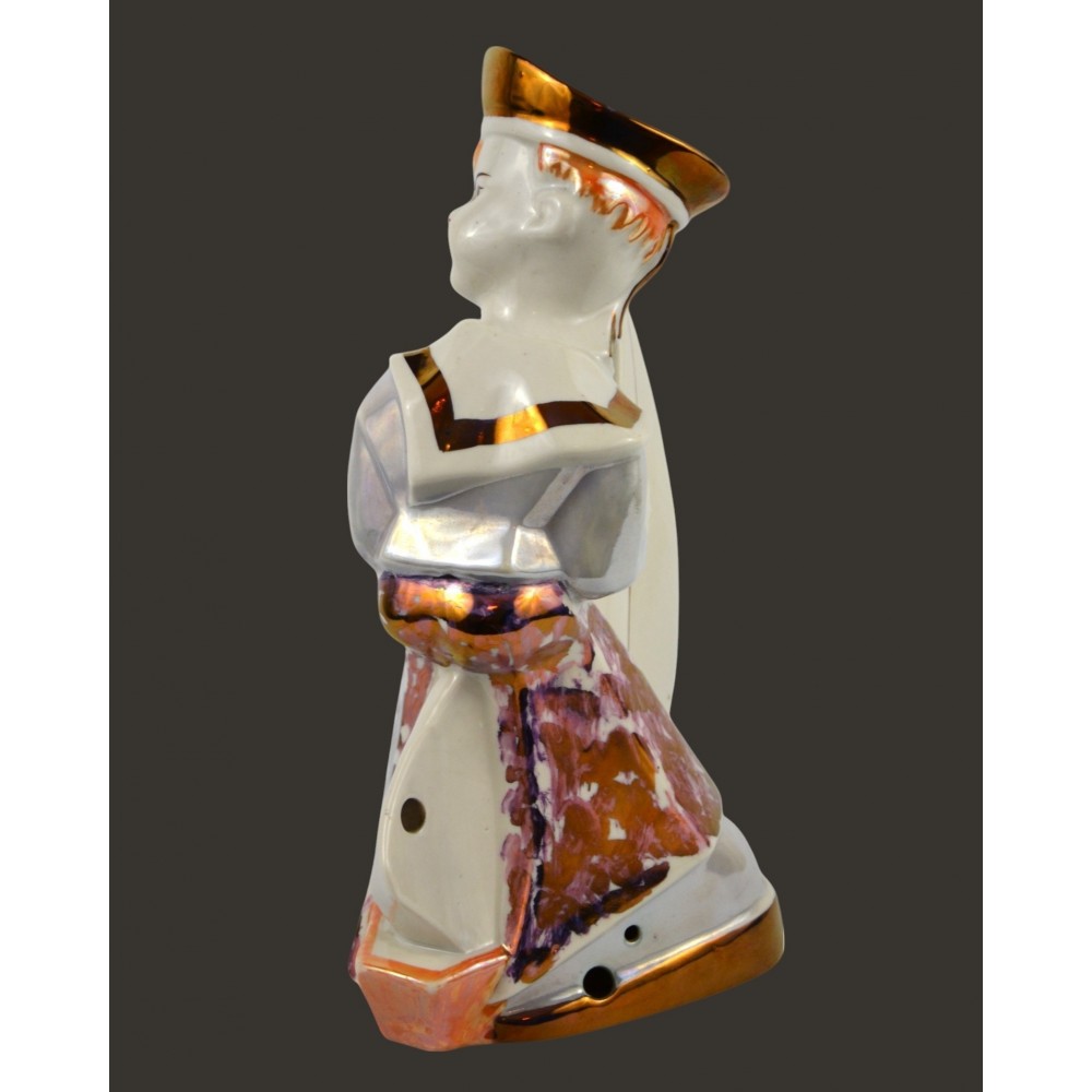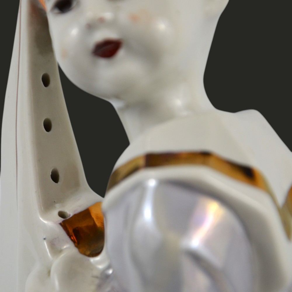 Żeglarz marynarz, pochłaniacz zapachów Steatyt Zygmunt Buksowicz Katowice lata50/60te . Figurka chłopca ubranego w marynarski strój z małą żaglówką między nogami. Na nogach nieproporcjonalnie duże buty o grubej podeszwie. Biała porcelana, dekorowana farbami lustrowymi, ze złotymi akcentami.