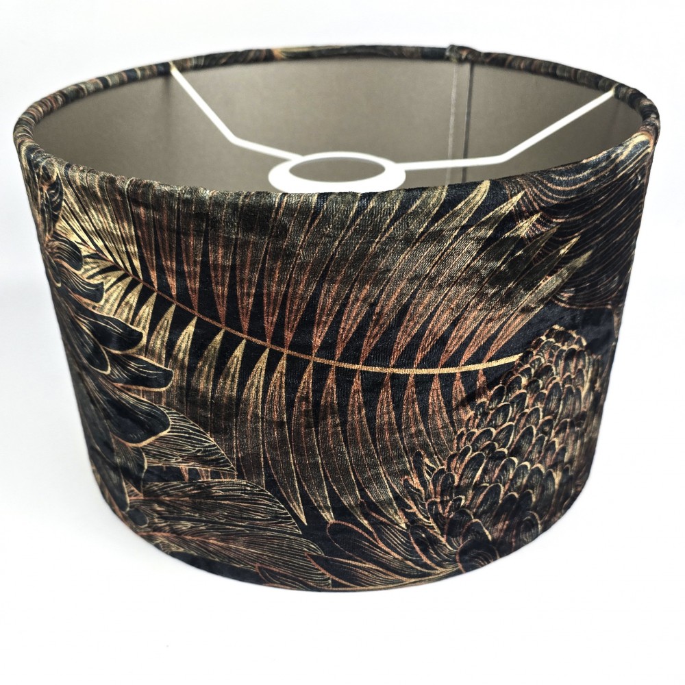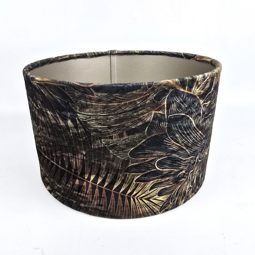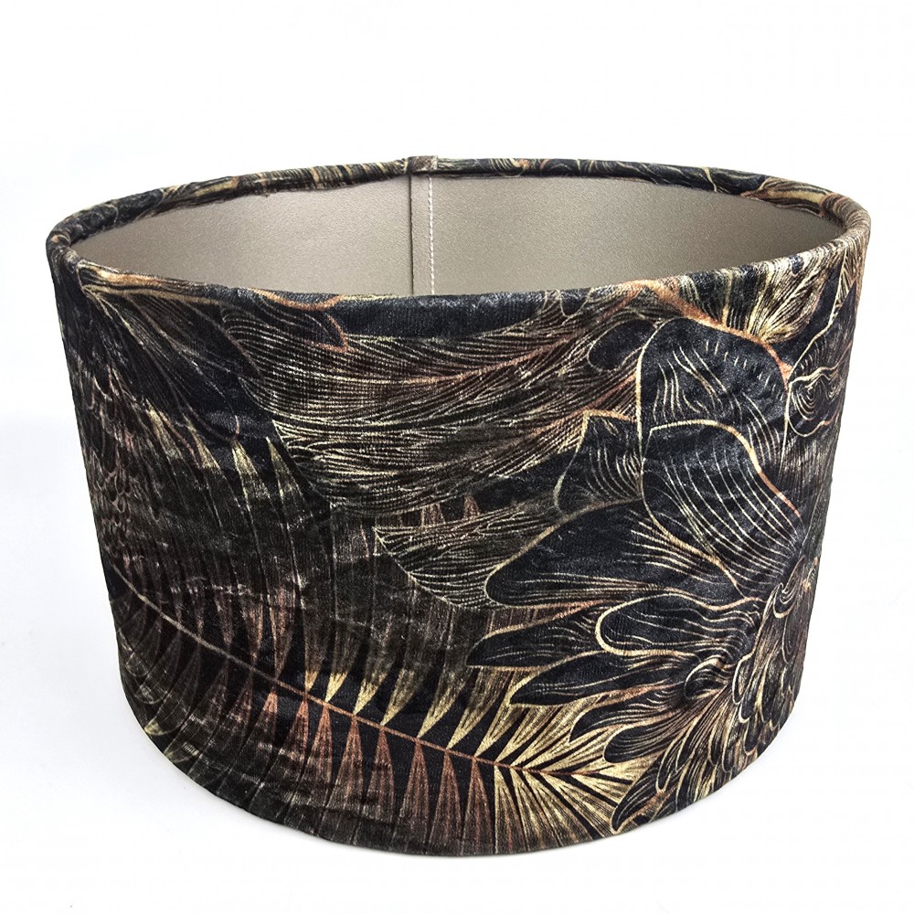 Nowoczesny, szyty abażur w kształcie walca do lampy stojącej lub wiszącej. Tkanina welurowa, ciemno zielone tło pokrywa motyw botaniczny - złote i rdzawe liście palm i monstery.