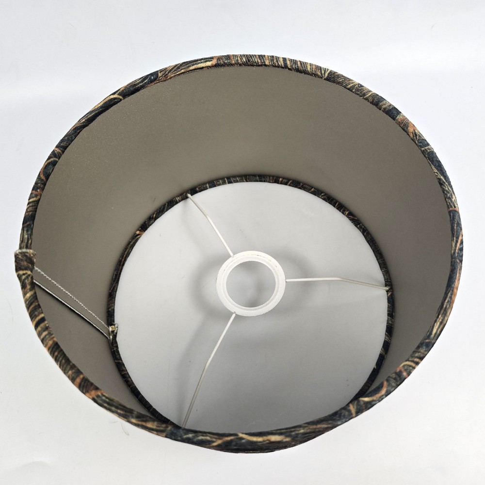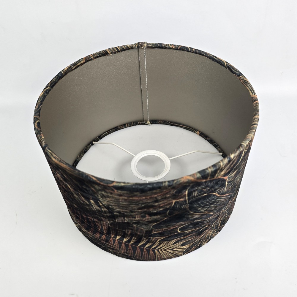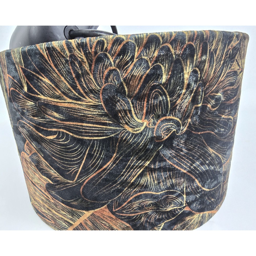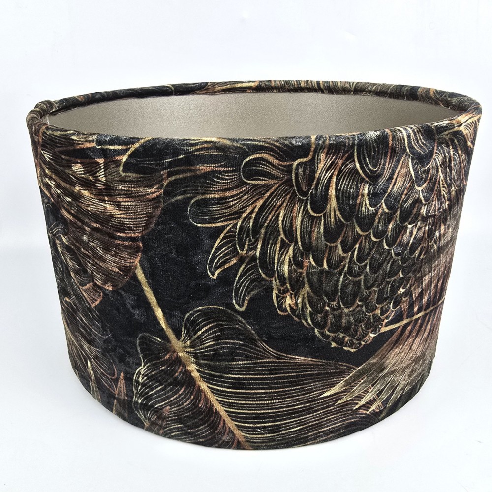 Nowoczesny, szyty abażur w kształcie walca do lampy stojącej lub wiszącej. Tkanina welurowa, ciemno zielone tło pokrywa motyw botaniczny - złote i rdzawe liście palm i monstery.