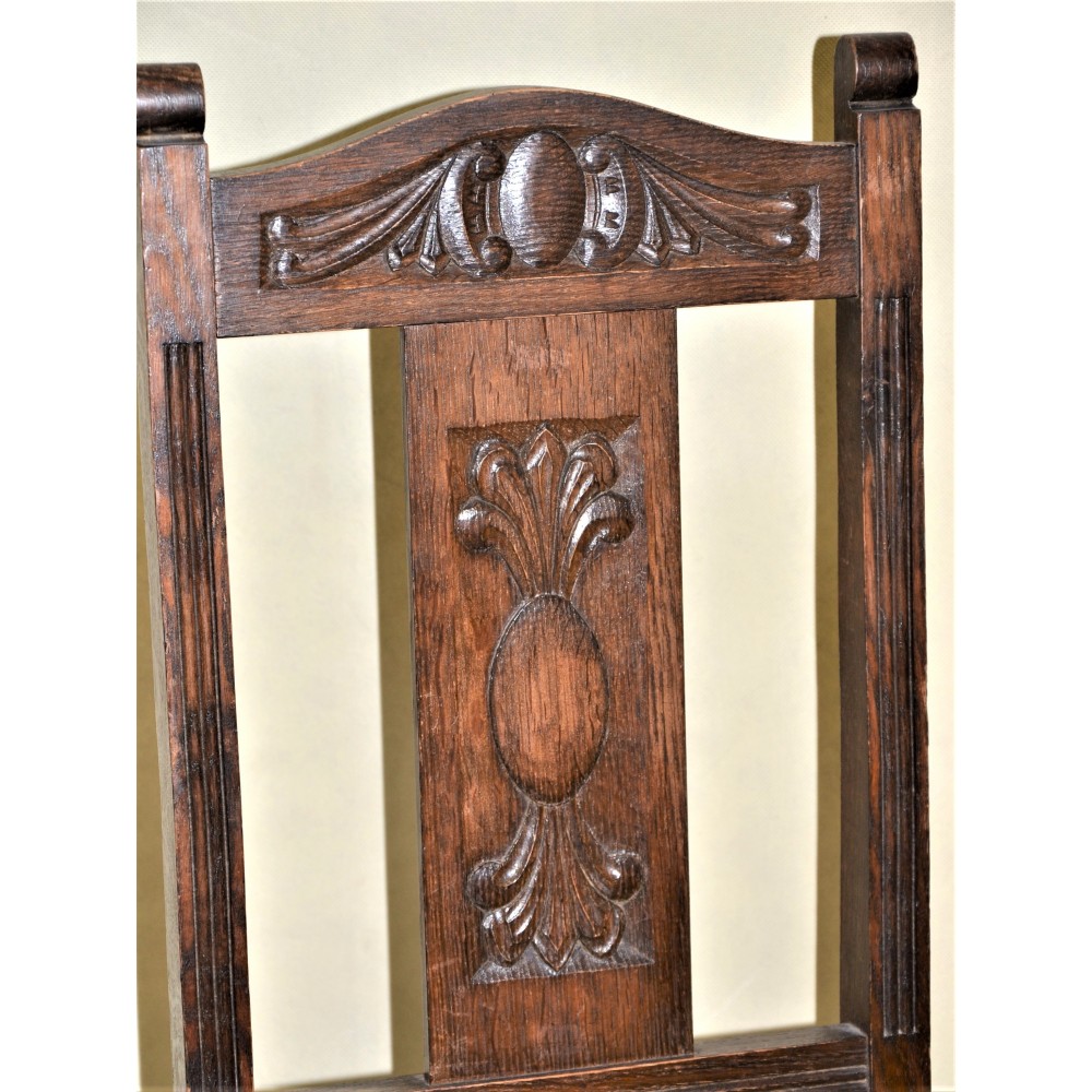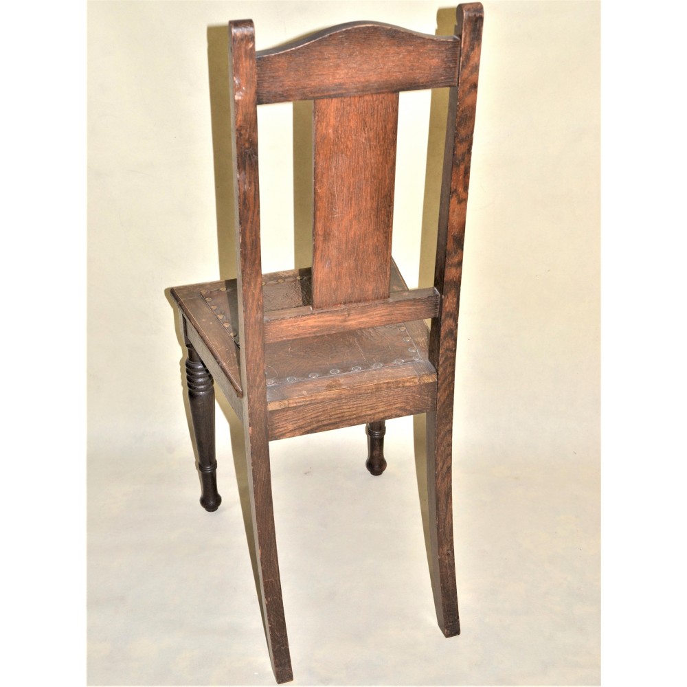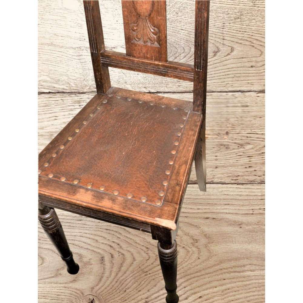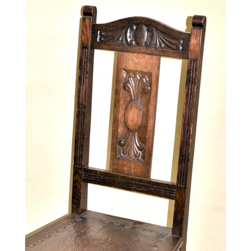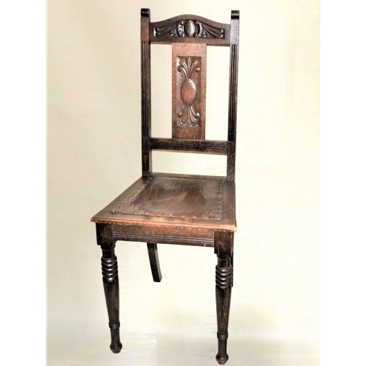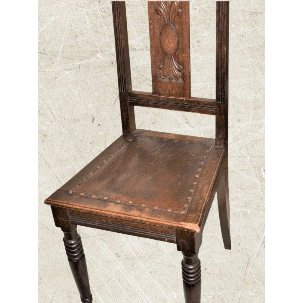 Bardzo ładna, zgrabna forma. Nogi przednie toczone w pierścienie, oparcie wąskie prostokątne rzeźbione w secesyjne wzory i dekorowane żłobieniami. Siedzisko skórzane obite ćwiekami, rama drewniana zwężająca się ku oparciu..