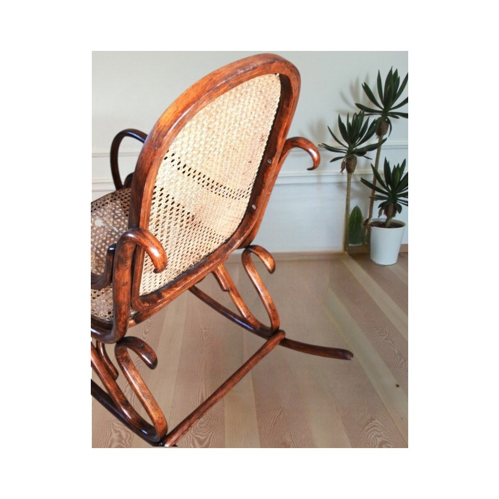 Fotel bujany z początku XXw wykonany z wysokiej jakości giętego drewna bukowego, doskonale wyprofilowany, lekki i mocny, z finezyjnie giętymi poręczami, wyplatanym oparciem i siedziskiem . Stan bardzo dobry, fotel niegdyś przeszedł renowację drewna brak oryginalnych metek producenta, siedzisko i oparcie w oryginalnym stanie zachowania, rafia wymaga napraw. Wymiary wys.105cm, szer.50cm,