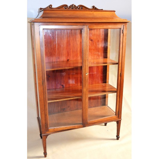 Oryginalna, angielska serwantka, orzechowa witryna delikatna, subtelna. Zgrabna prostokątna konstrukcja osadzona na wysokich graniasto zbieżnych nogach zakończonych stopami w kształcie szpadla. Witrynka wykończona wyniesionym do góry dekoracyjnym gzymsem z ażurową koroną na tylnej ścianie. Drzwi i boki oszklone, zamki oryginalne mosiężne z dodatkową blokadą na jedno skrzydło. W środku dwie drewniane półki oparte na mosiężnych listewkach.