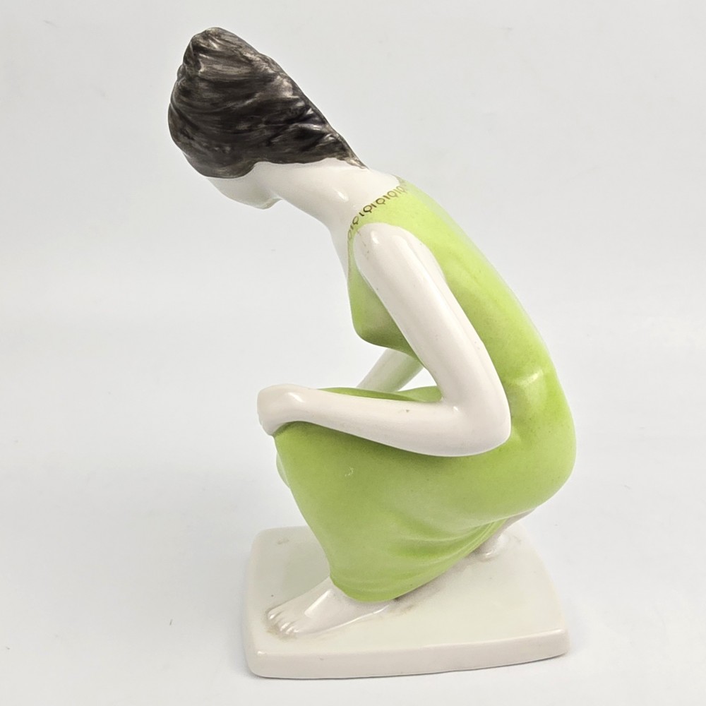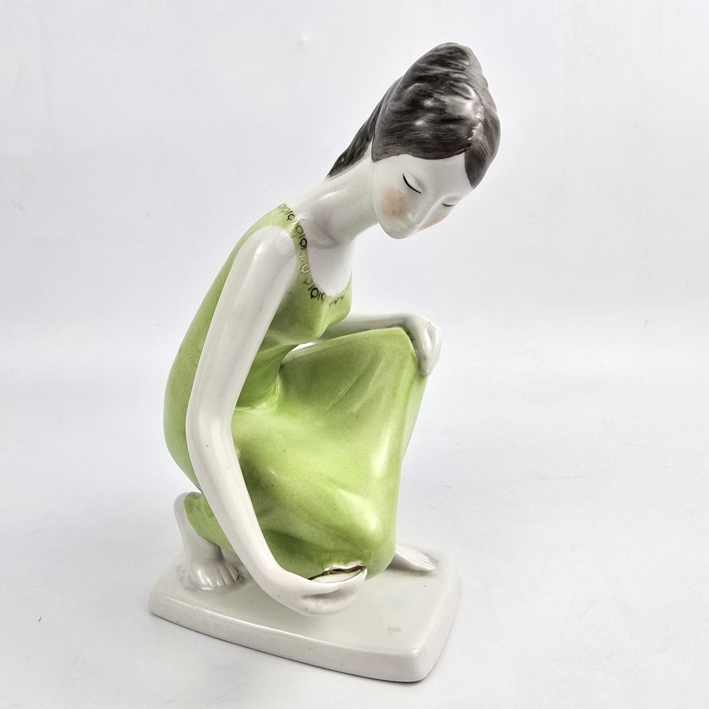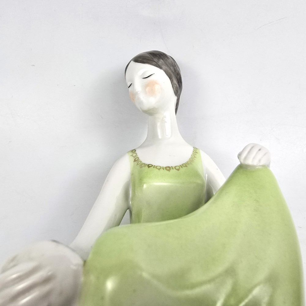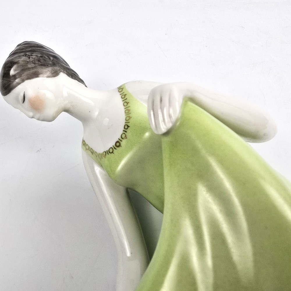Vintage lata 60te. Kolekcjonerska figurka kobieta w zielonej (seledynowej) sukience trzymająca miseczkę z zaczerpniętą wodą. Wyrób węgierskiej wytwórni Hollohaza, projektant: Istvánné Torma . Ładna forma, markowa porcelana, unikalna zielona kolorystyka. podstawa 7/ 11,5cm szer.10cm wys. 17 cm