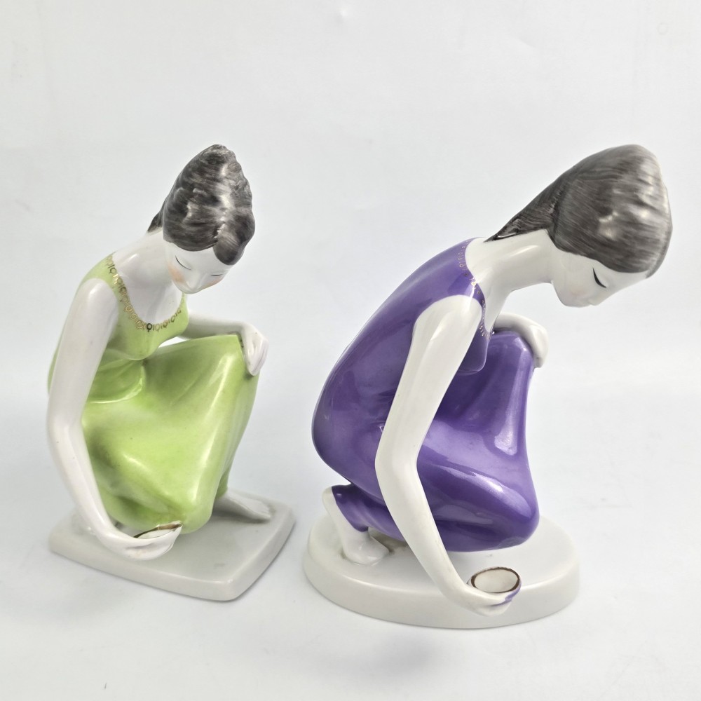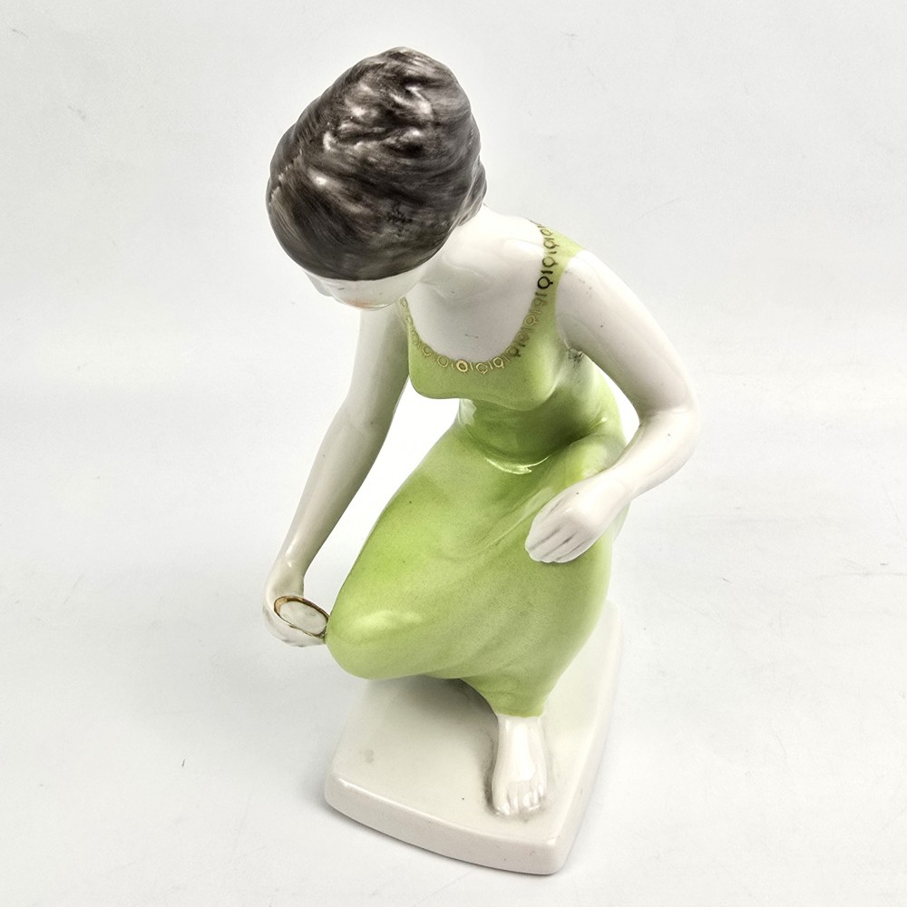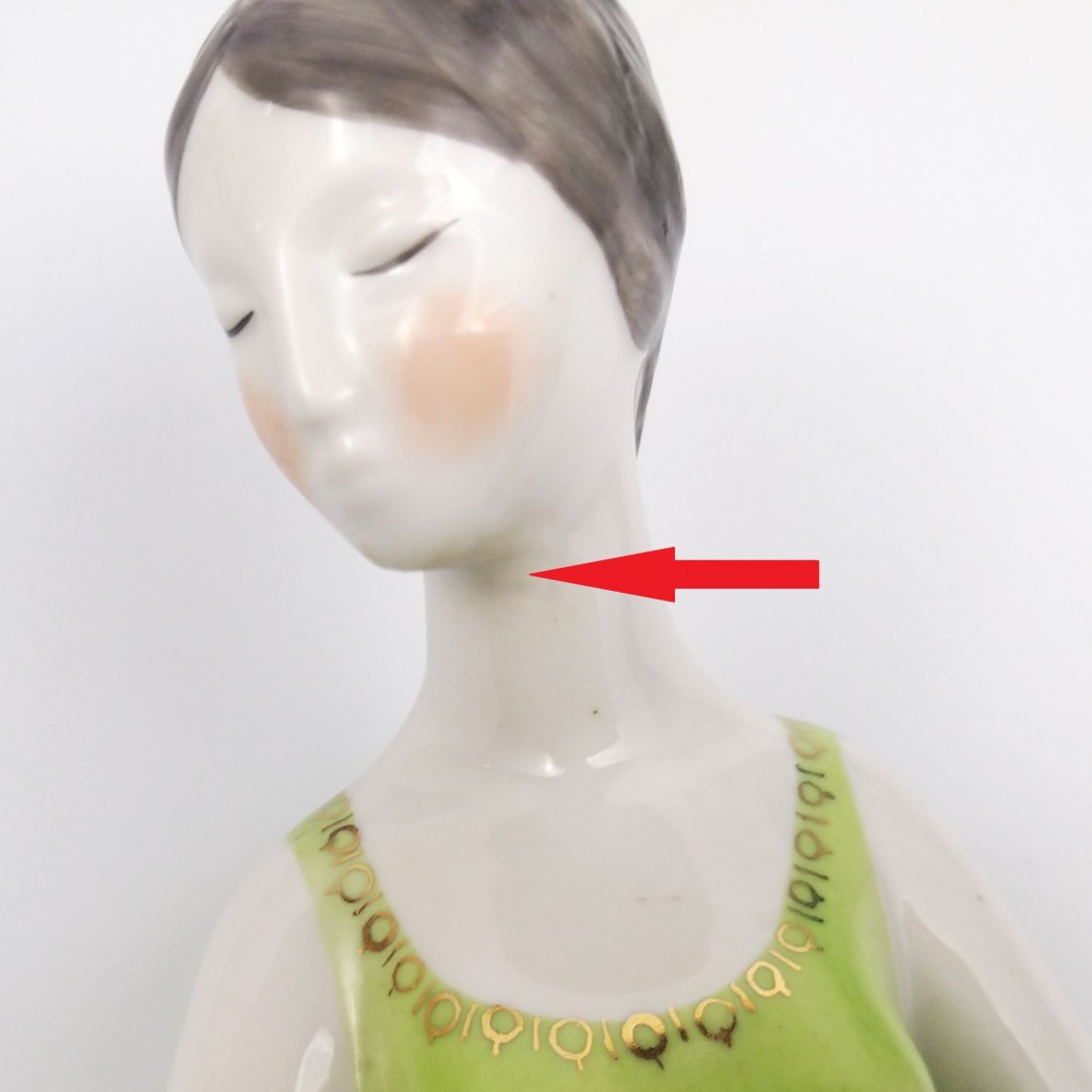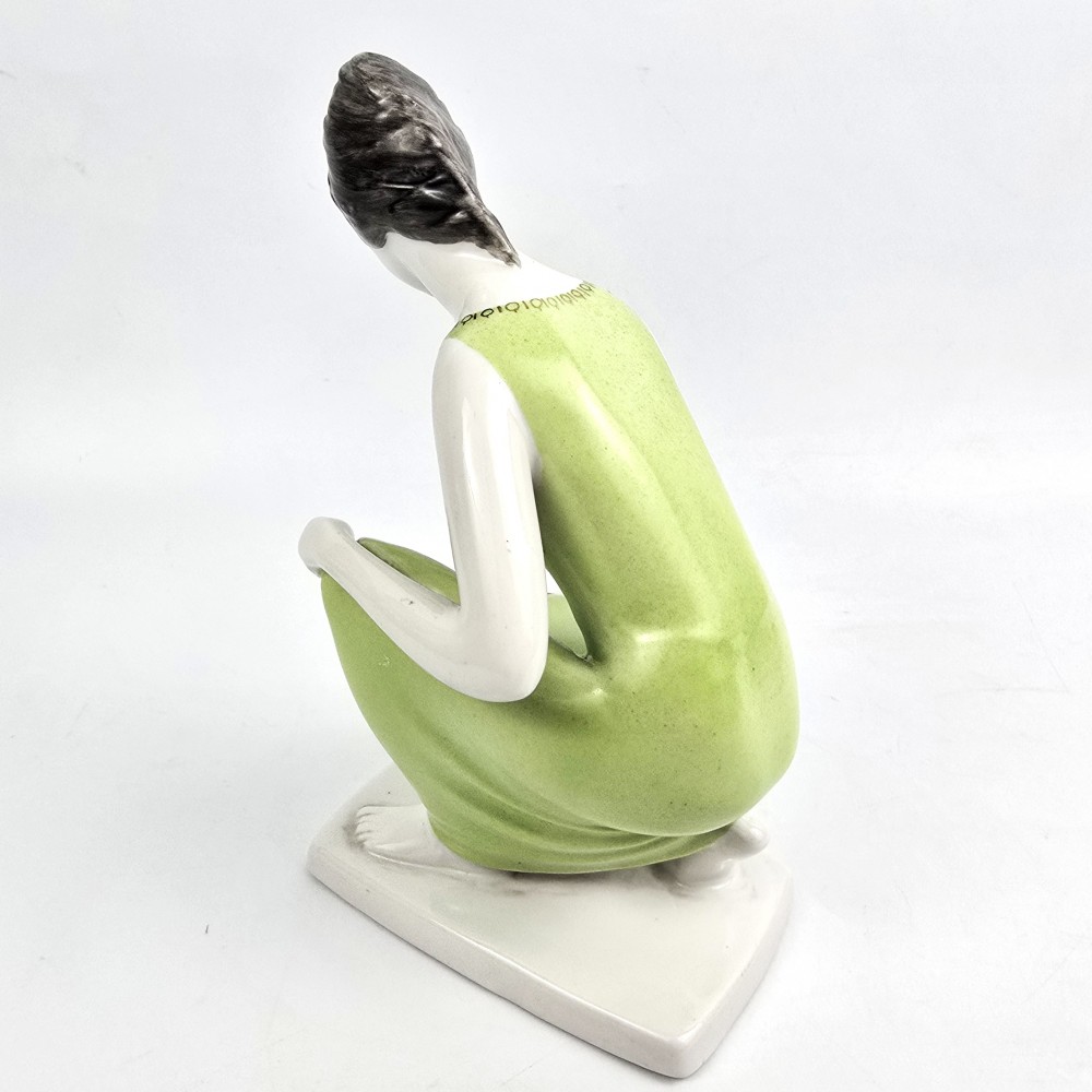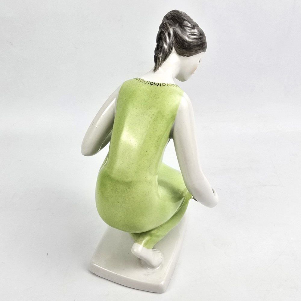 Vintage lata 60te. Kolekcjonerska figurka kobieta w zielonej (seledynowej) sukience trzymająca miseczkę z zaczerpniętą wodą. Wyrób węgierskiej wytwórni Hollohaza, projektant: Istvánné Torma . Ładna forma, markowa porcelana, unikalna zielona kolorystyka. podstawa 7/ 11,5cm szer.10cm wys. 17 cm