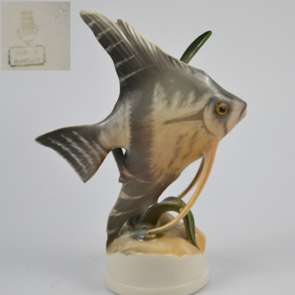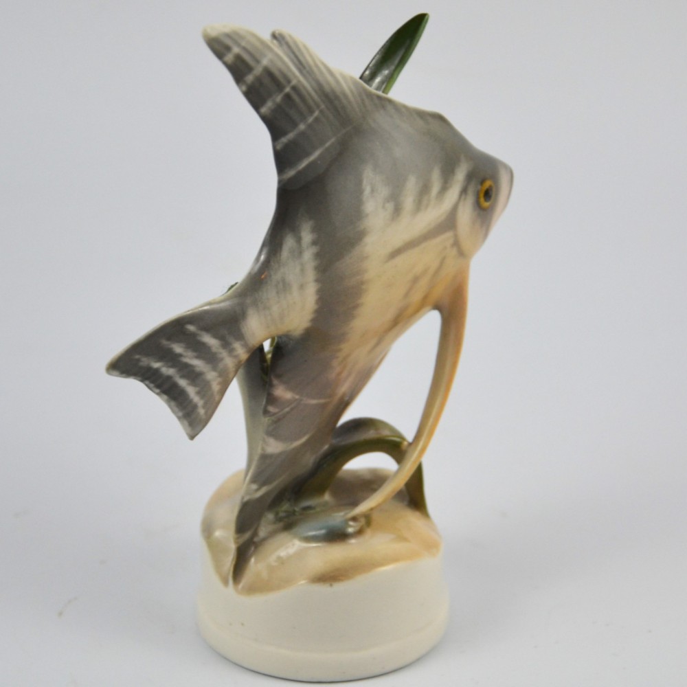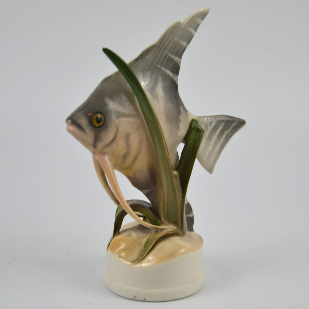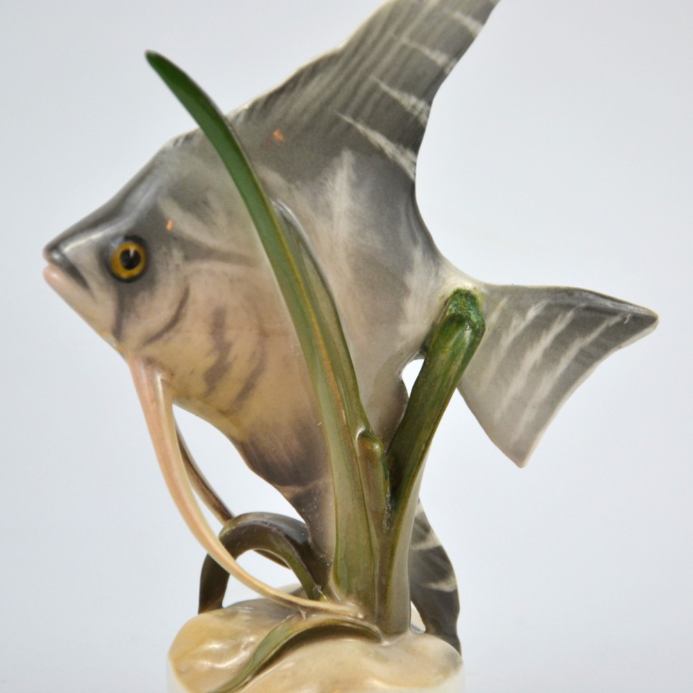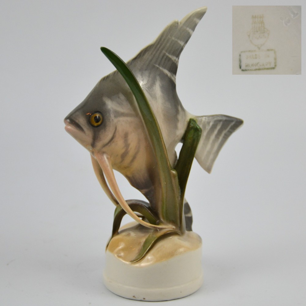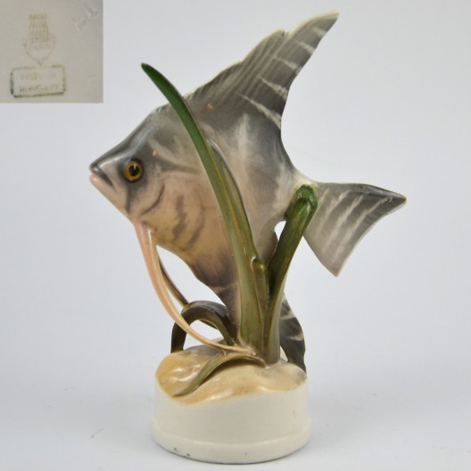 Interesująca figurka do kolekcji ryb, skalar wśród roślinności wodnej. Projektant Miklós Veres ? sygnatura Zsolnay lata 30te. Piękna realistycznie spłaszczona forma, ładna szaro oliwkowa kolorystyka. Doskonale prezentuje się przy skalarach ENS i Royal Dux. Wys.15cm szer. 12cm, stan bardzo dobry, niewielkim mankamentem jest ułamana końcówka jednej gałązki. Przedmiot bardzo oryginalny, coraz rzadziej spotykany na aukcjach i galeriach antyków. Kolekcjonerów, designerów, miłośników ryb, wędkarstwa i znawców tematu zachęcam do zakupu.