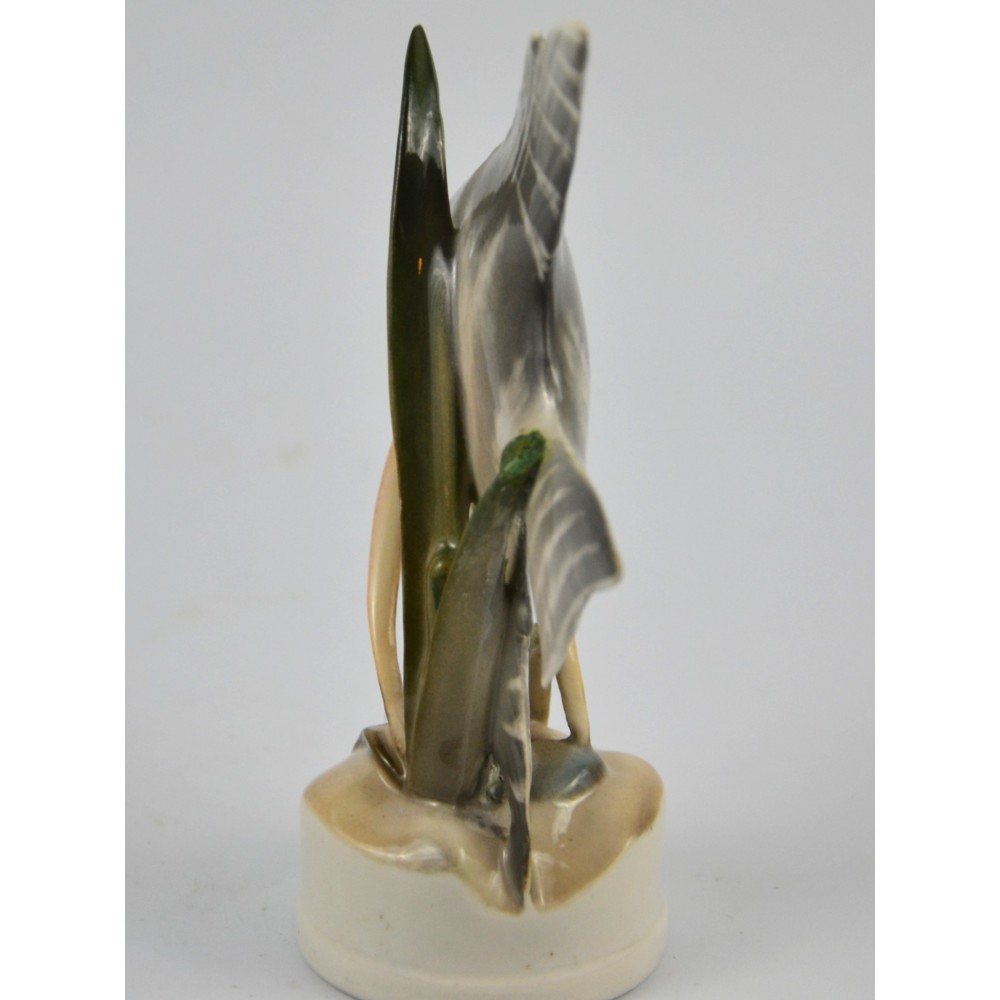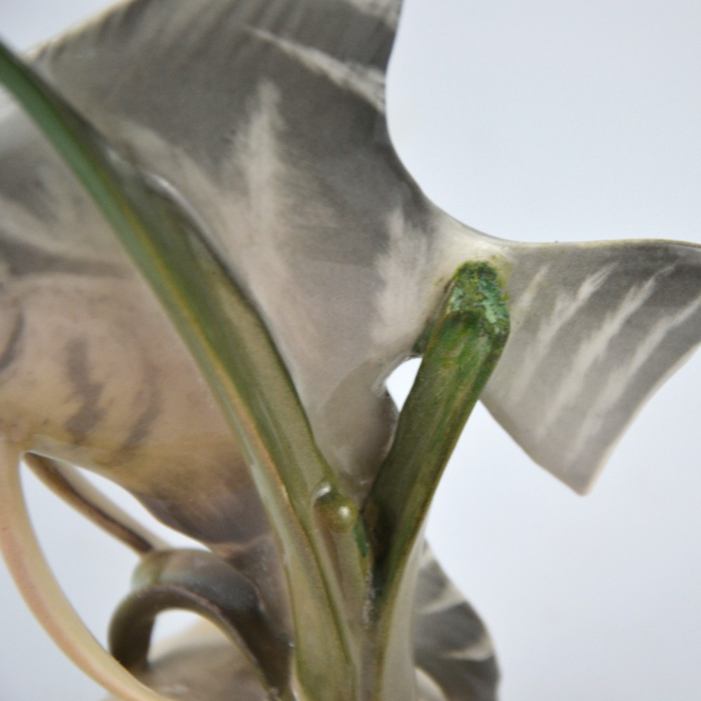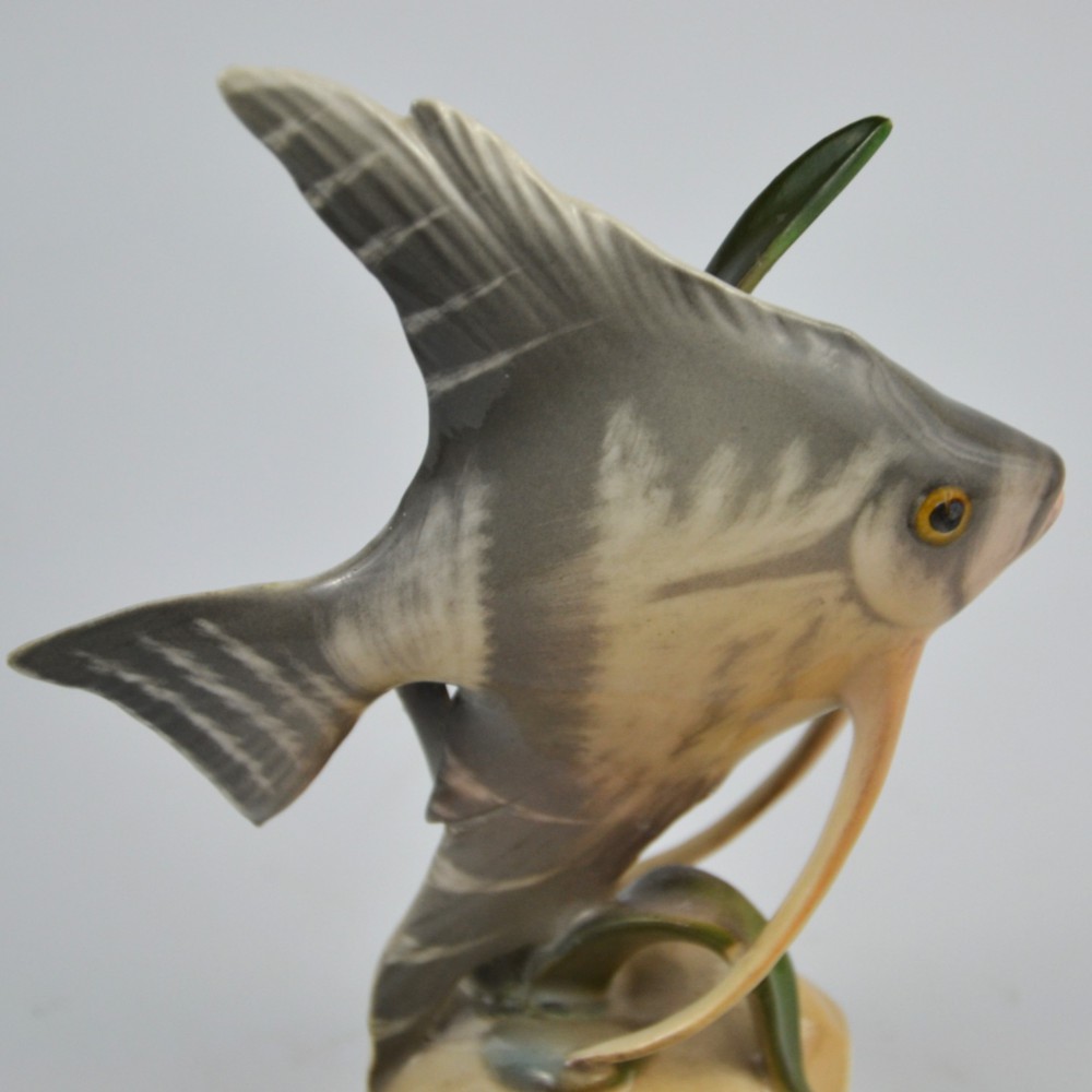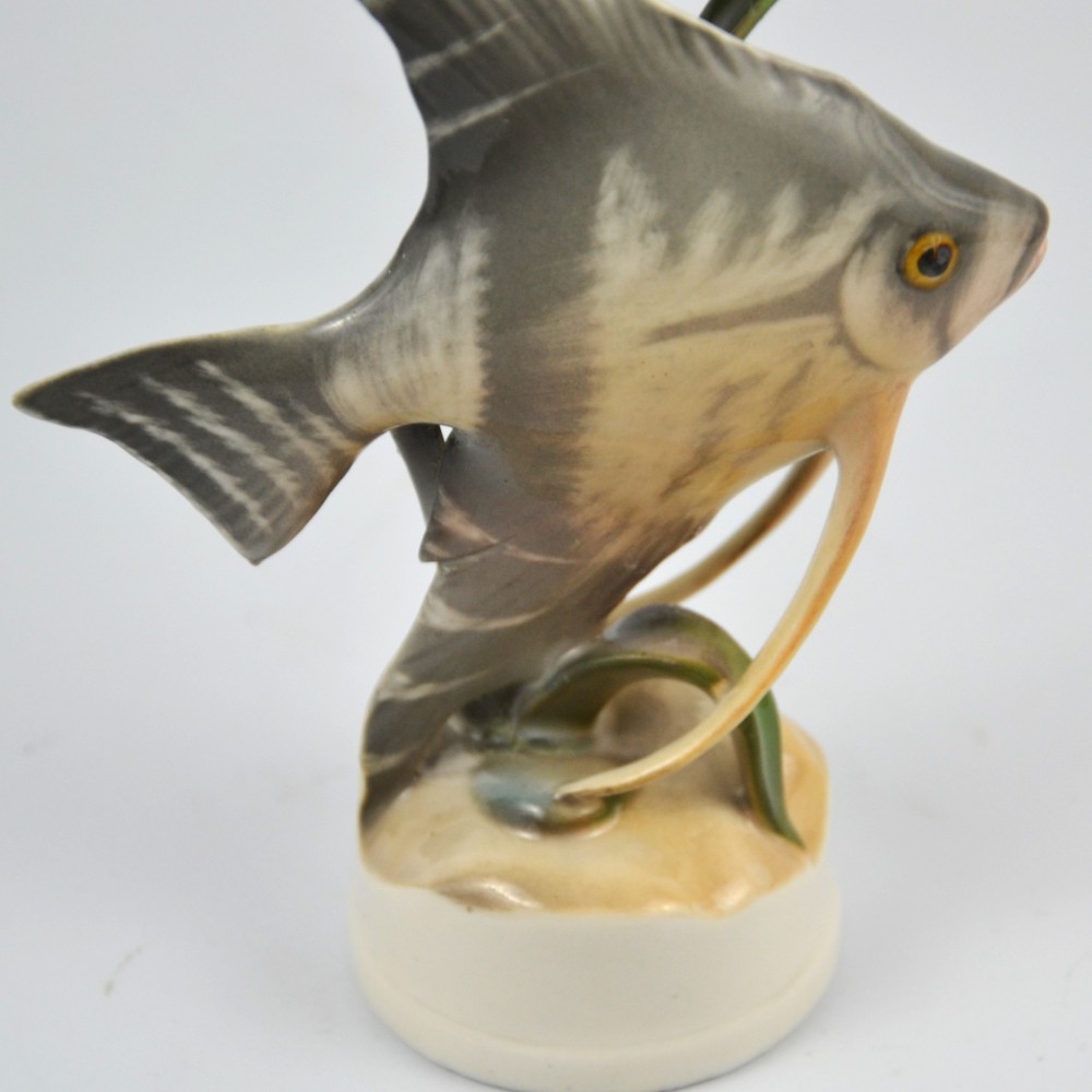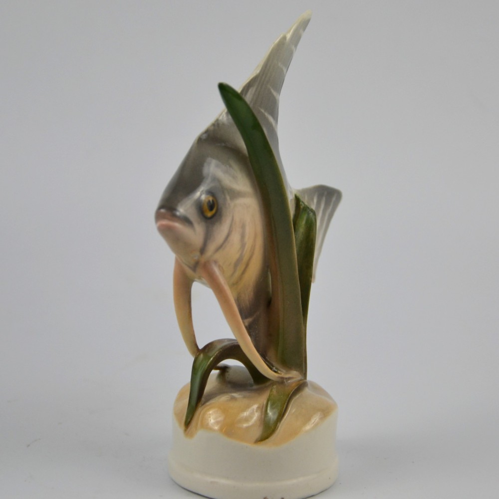 Interesująca figurka do kolekcji ryb, skalar wśród roślinności wodnej. Projektant Miklós Veres ? sygnatura Zsolnay lata 30te. Piękna realistycznie spłaszczona forma, ładna szaro oliwkowa kolorystyka. Doskonale prezentuje się przy skalarach ENS i Royal Dux. Wys.15cm szer. 12cm, stan bardzo dobry, niewielkim mankamentem jest ułamana końcówka jednej gałązki. Przedmiot bardzo oryginalny, coraz rzadziej spotykany na aukcjach i galeriach antyków. Kolekcjonerów, designerów, miłośników ryb, wędkarstwa i znawców tematu zachęcam do zakupu.