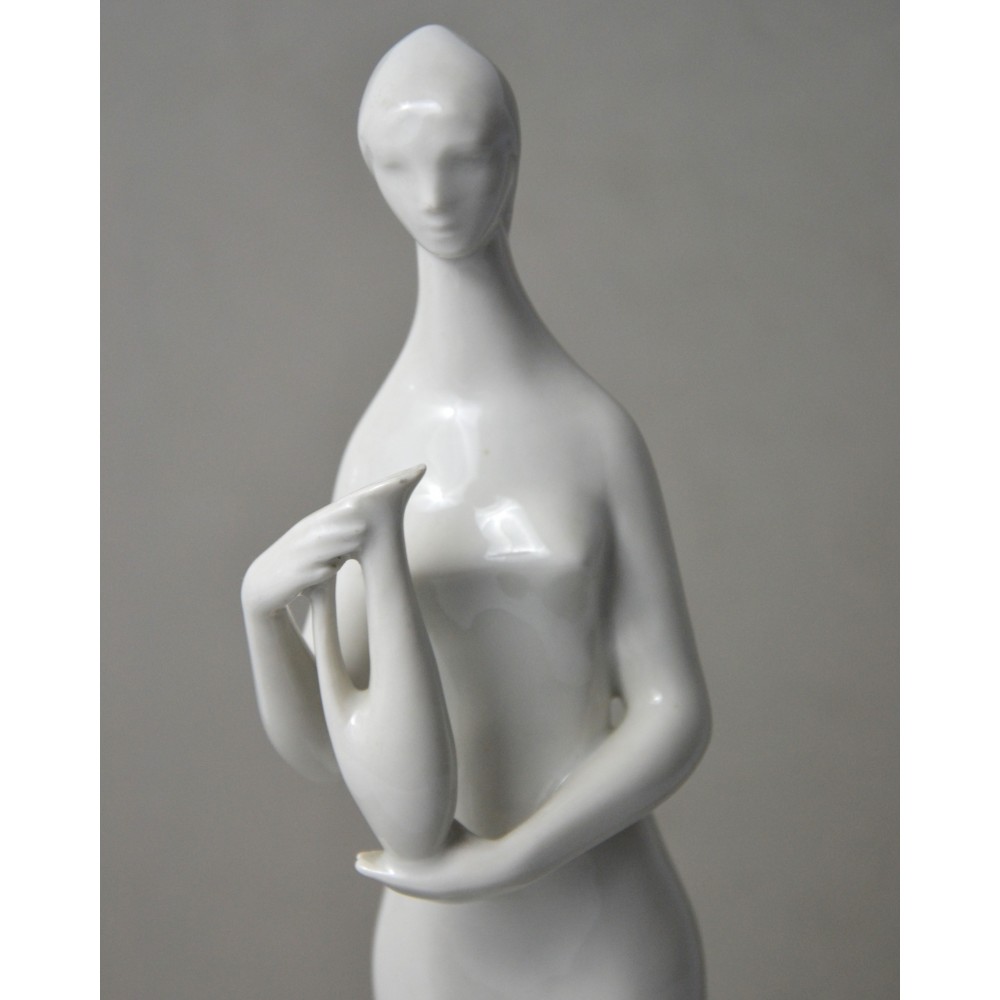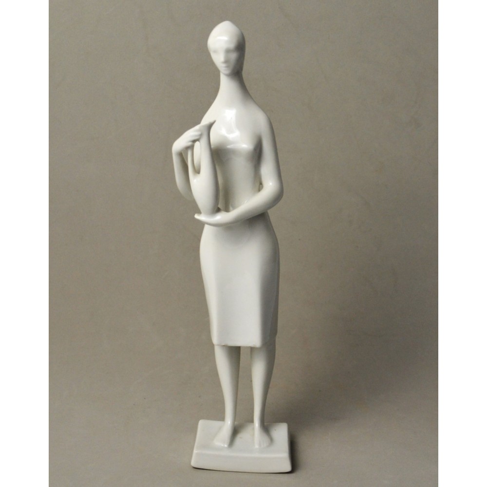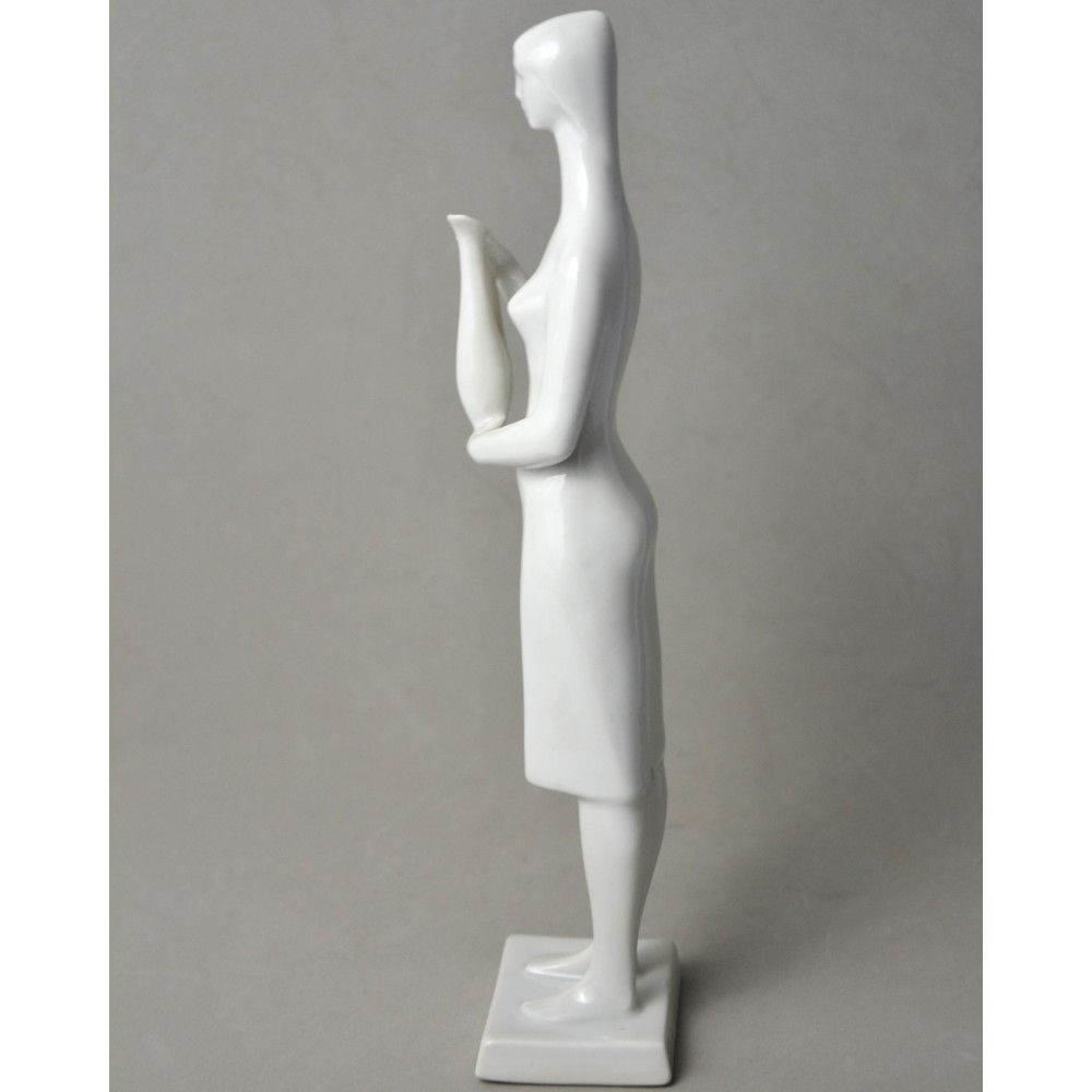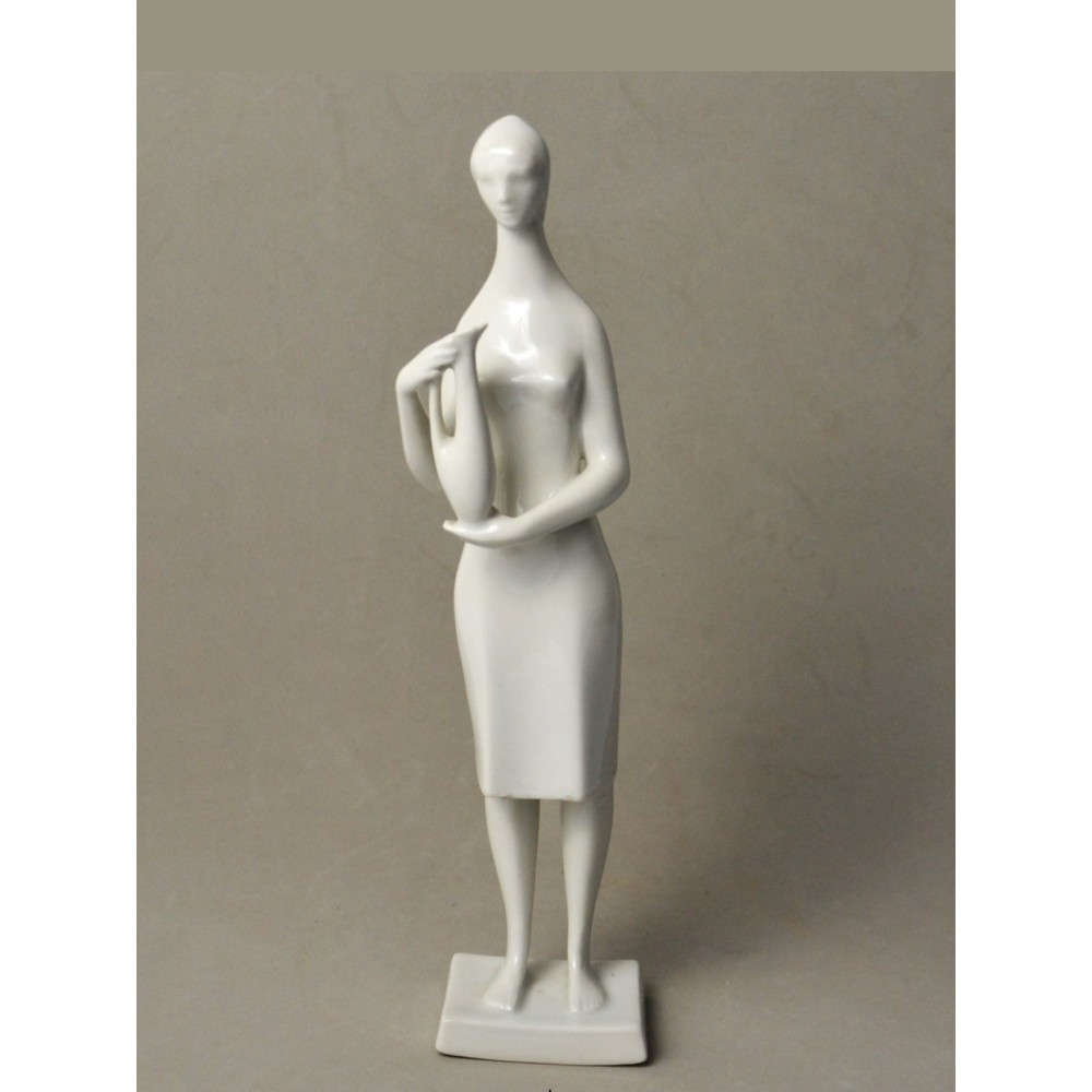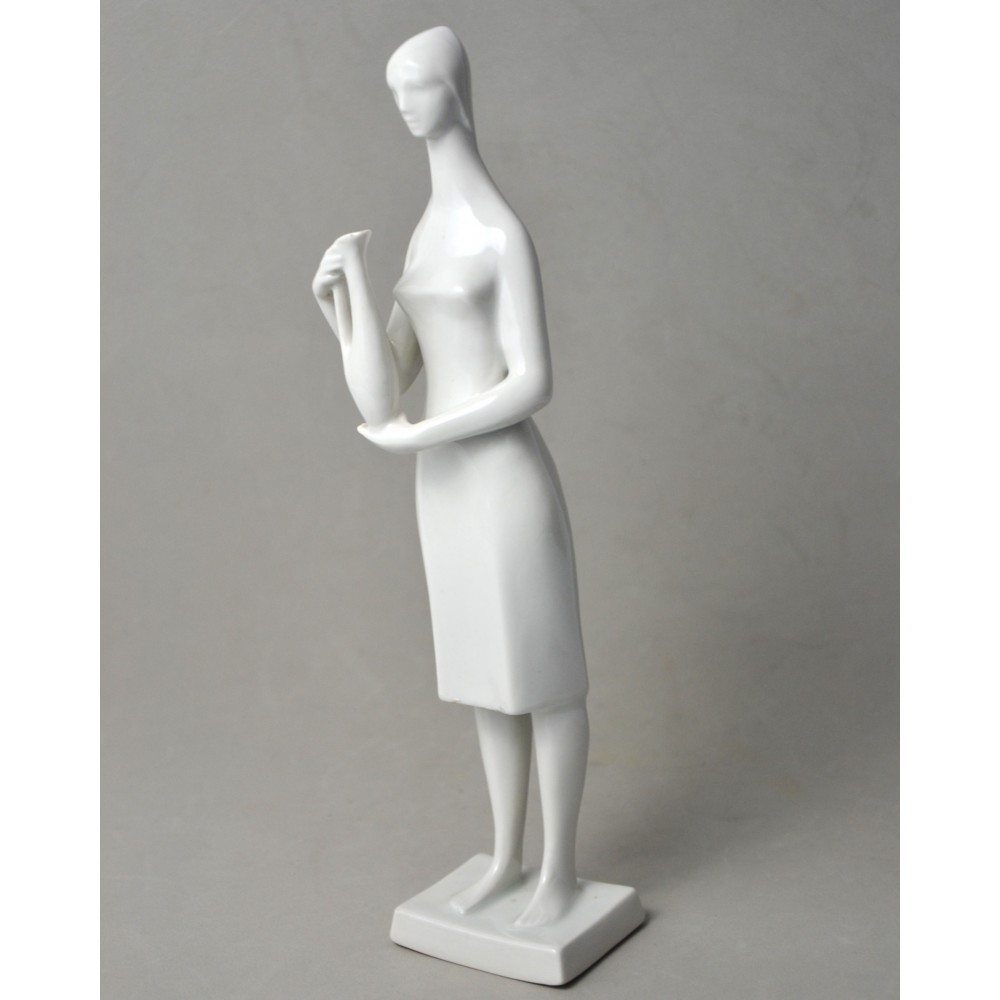 Rzadko spotykana, kolekcjonerska figurka : kobieta trzymająca dzban, wazon. Jeden z unikalnych projektów z lat 60tych Töröka Jánosa z serii modernistycznych rzeźb figuralnych . Sygnatura węgierskiej wytwórni porcelany Zsolnay. Przykład wspaniałego wzornictwa z lat 60-tych, nowoczesna forma, biała markowa porcelana wys.28cm podstawa 5/6cm, stan bardzo dobry, drobnym mankamentem są nadlane krople porcelany na dole sukienki dwie z przodu i jedna z tyłu . Piękny projekt, bardzo rzadko pojawiający się na rynku antyków.