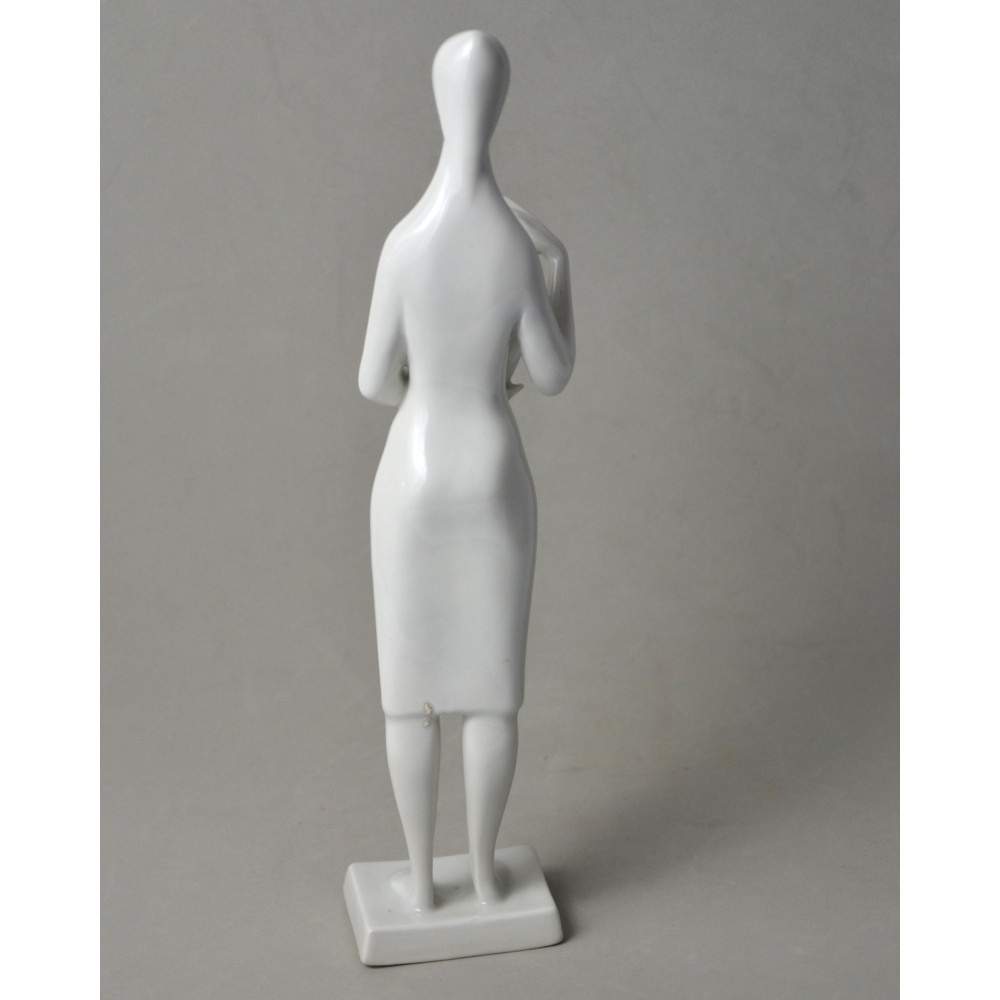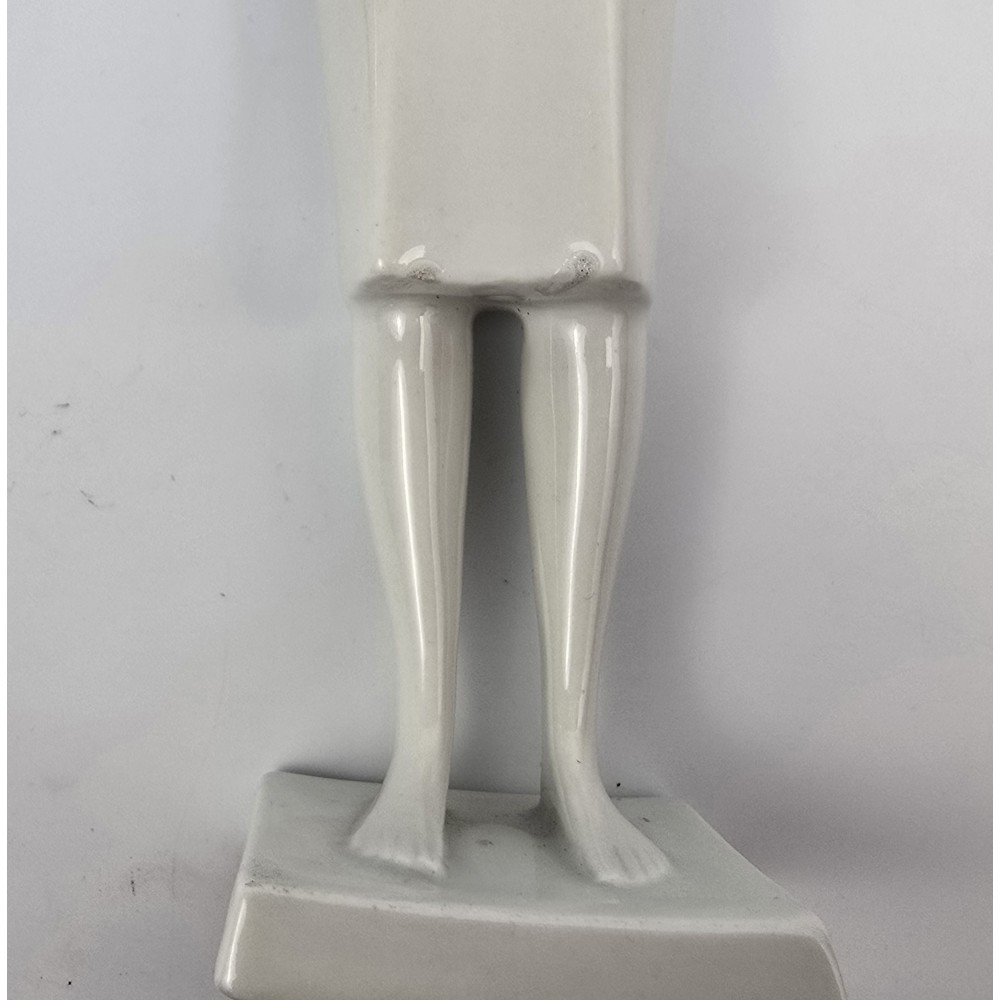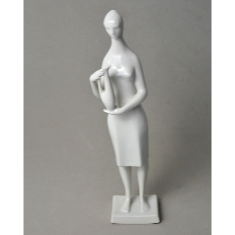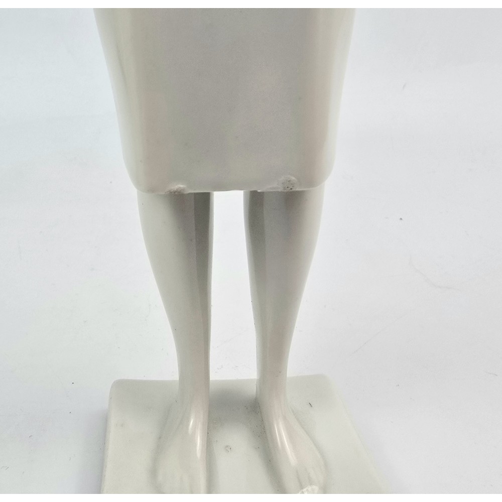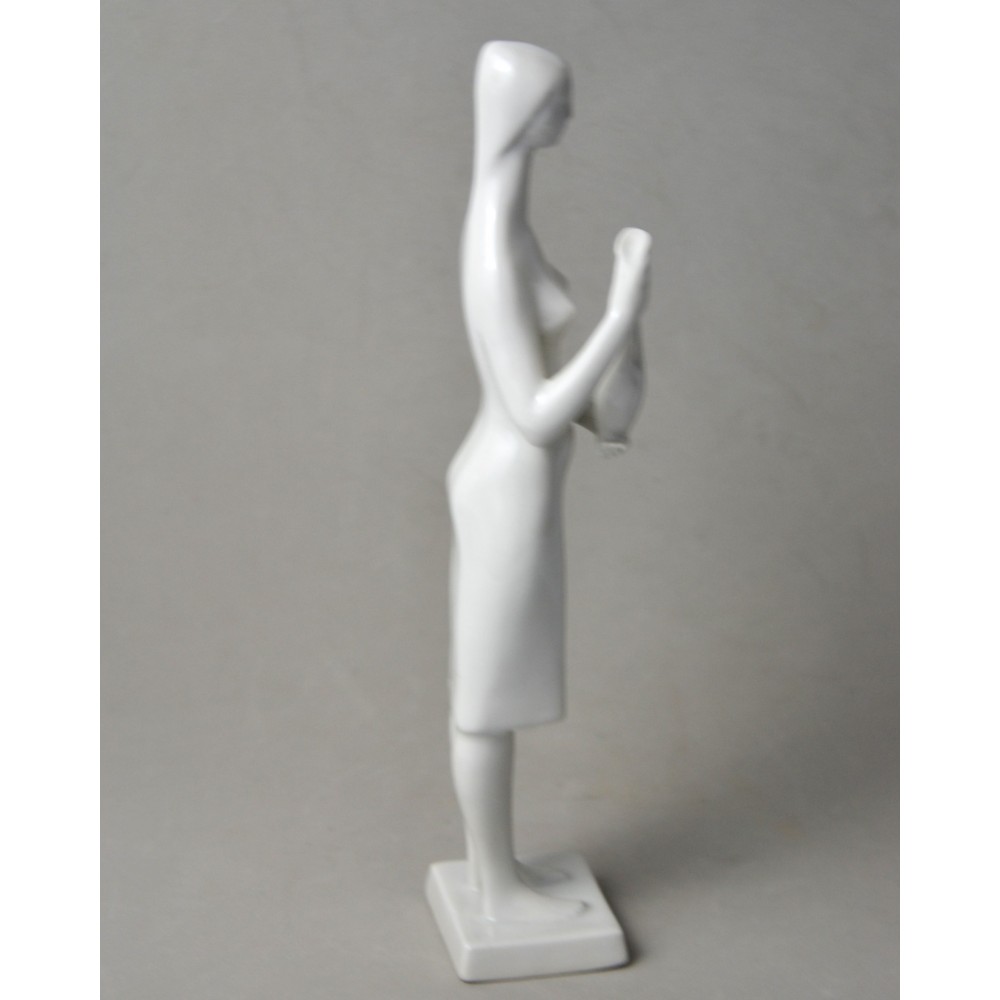 Rzadko spotykana, kolekcjonerska figurka : kobieta trzymająca dzban, wazon. Jeden z unikalnych projektów z lat 60tych Töröka Jánosa z serii modernistycznych rzeźb figuralnych . Sygnatura węgierskiej wytwórni porcelany Zsolnay. Przykład wspaniałego wzornictwa z lat 60-tych, nowoczesna forma, biała markowa porcelana wys.28cm podstawa 5/6cm, stan bardzo dobry, drobnym mankamentem są nadlane krople porcelany na dole sukienki dwie z przodu i jedna z tyłu . Piękny projekt, bardzo rzadko pojawiający się na rynku antyków.