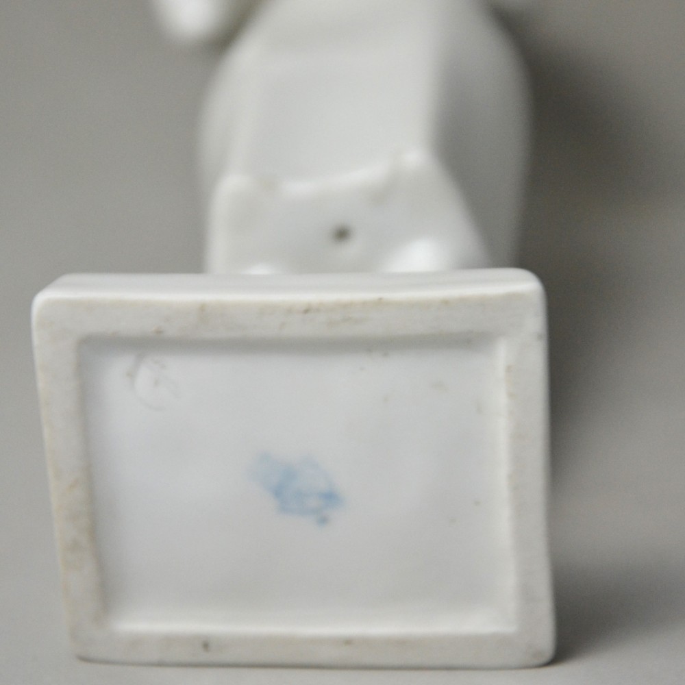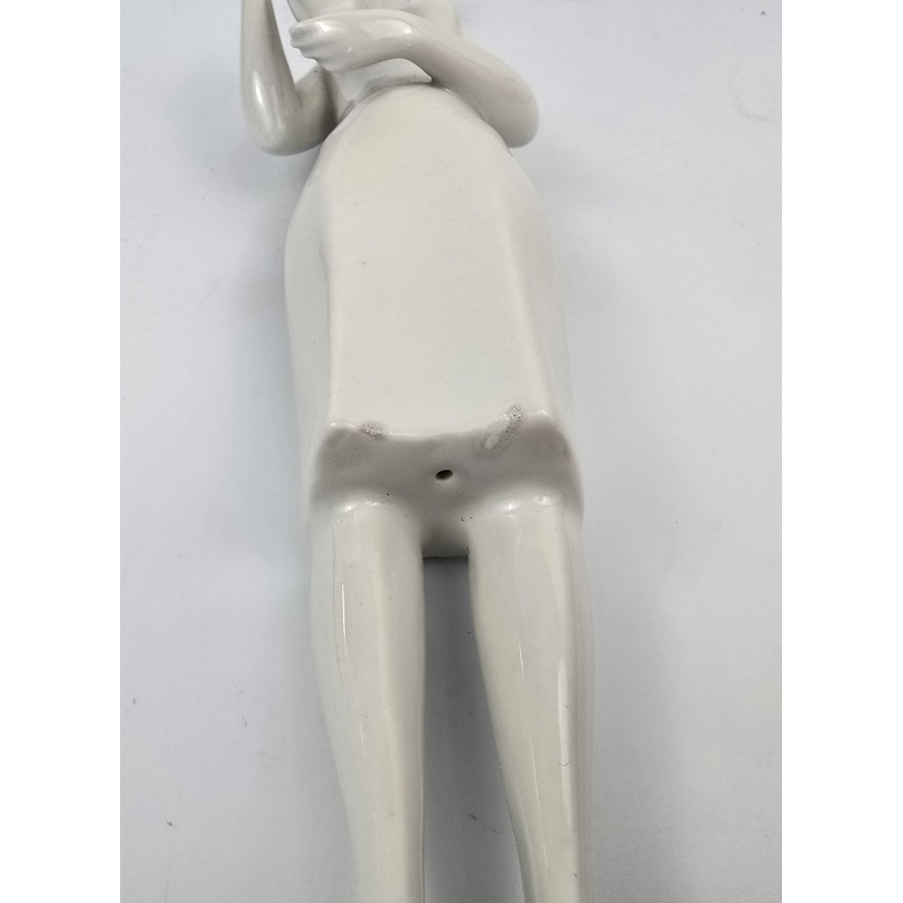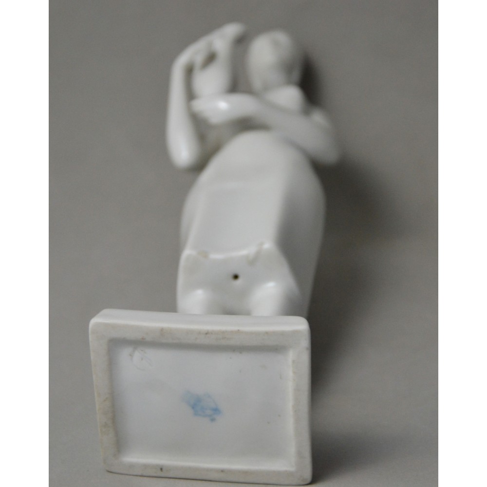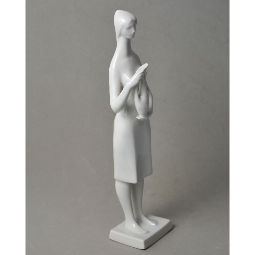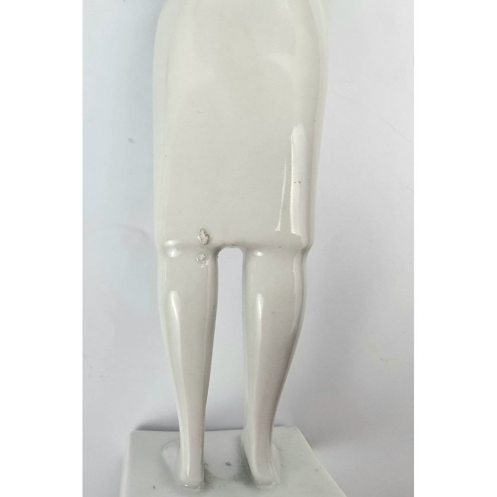 Rzadko spotykana, kolekcjonerska figurka : kobieta trzymająca dzban, wazon. Jeden z unikalnych projektów z lat 60tych Töröka Jánosa z serii modernistycznych rzeźb figuralnych . Sygnatura węgierskiej wytwórni porcelany Zsolnay. Przykład wspaniałego wzornictwa z lat 60-tych, nowoczesna forma, biała markowa porcelana wys.28cm podstawa 5/6cm, stan bardzo dobry, drobnym mankamentem są nadlane krople porcelany na dole sukienki dwie z przodu i jedna z tyłu . Piękny projekt, bardzo rzadko pojawiający się na rynku antyków.