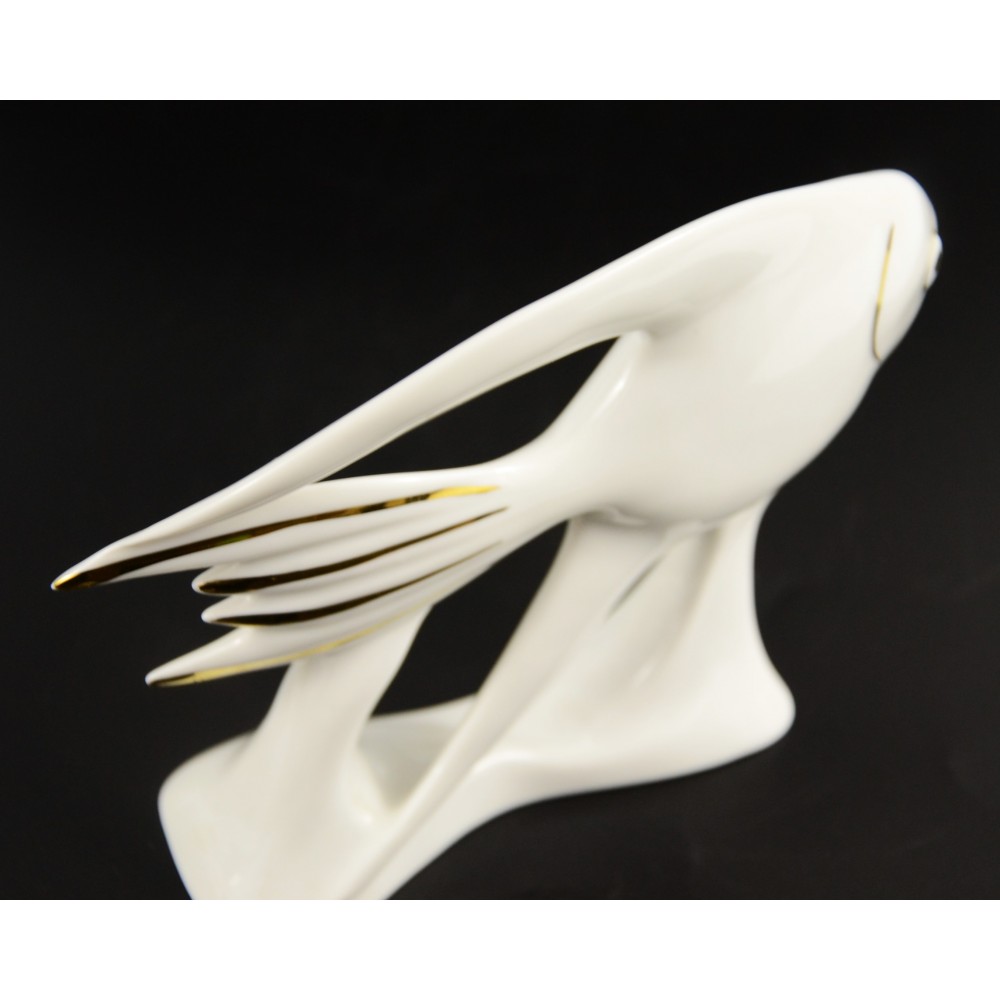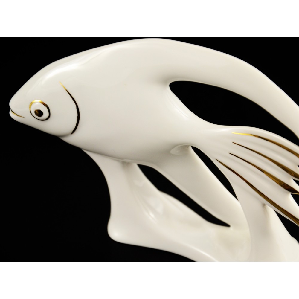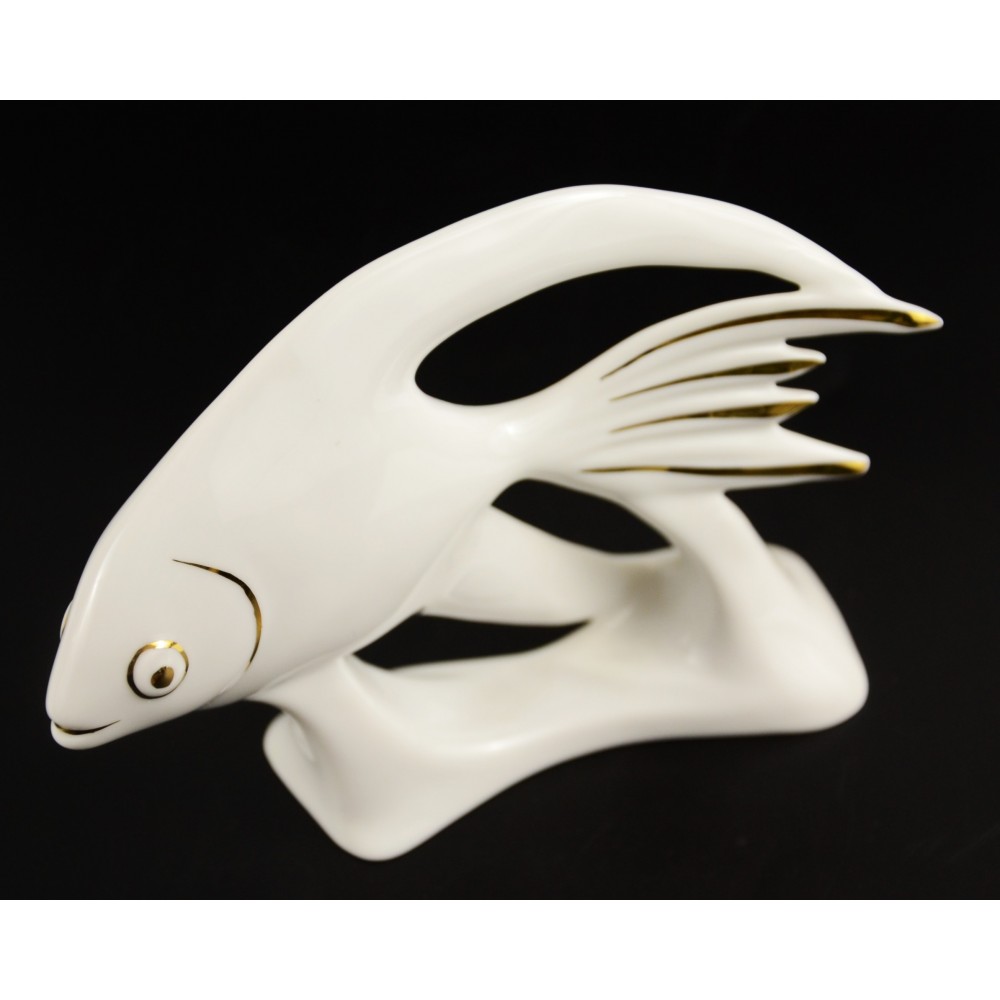 Rzadkość na polskim rynku antyków, porcelanowy design z lat 90tych . Modernistyczna ryba z węgierskiej wytwórni Hollohaza. Charakterystyczna forma, lekko spłaszczona, wydłużona, obłe kształty z diagonalnymi elementami. Porcelana markowa, biała ze złotymi akcentami Wys.12cm. Szer.16,5cm. stan bardzo ładny.