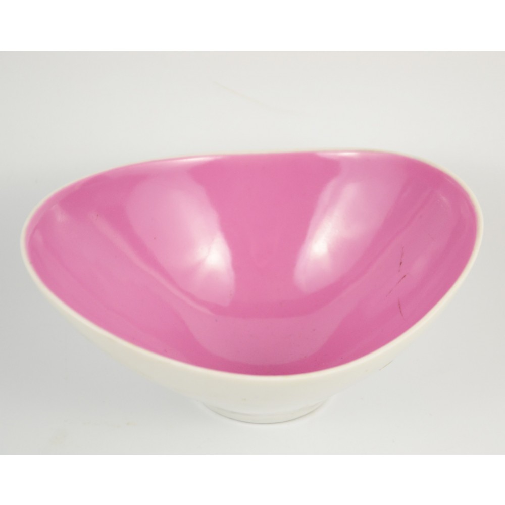 Salaterka, miseczka z lat 60tych sygnowana znakiem czeskiej wytwórni Royal Dux. Projekt Jindřicha Marka, klasyczny przykład stylu brukselskiego, skupia w sobie wiodące cechy wyrafinowanego designu połowy XXw. Wspaniała modernistyczna forma, żywa biało różowa kolorystyka . Wysokość: 6 cm. Średnica:13,3 cm. x 10,2 cm. stan bardzo dobry bez uszkodzeń niewielkie ślady użytkowania drobne ryski w środku miseczki ( patrz fotografie). Interesujący model doskonale pasujący do kolekcji Ćmielowa i innych wytwórni z lat 60tych. Znawców tematu, kolekcjonerów i designerów zachęcam do zakupu. Zdecydowanie polecam.