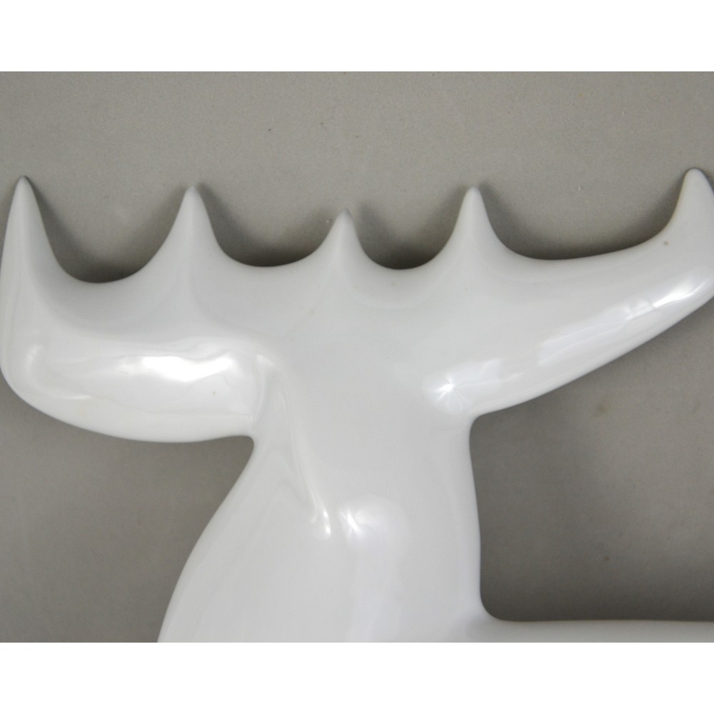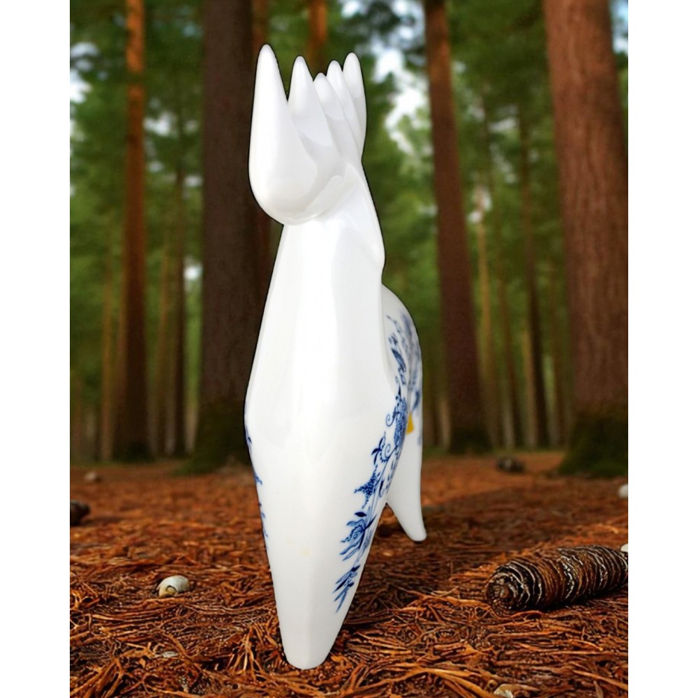 Jeleń, łoś z kolekcji figurek w stylu brukselskim, zaprojektowany w latach 60 przez Vladimira Davida. Bardzo ładna, modernistyczna forma o charakterystycznych obłych kształtach. Gładka biała malatura ozdobiona kobaltowym wzorem cebulowym. Egzemplarz w dużym rozmiarze wys.26cm szer.23 cm gł.8cm. Stan bardzo ładny, minimalne ślady użytkowania Oryginalna, gustowna figurka, porcelana wysokiej jakości, słynnego projektanta renomowana wytwórnia. Praktycznie nie do zdobycia. Designerów, kolekcjonerów i znawców tematu zachęcam do zakupu.