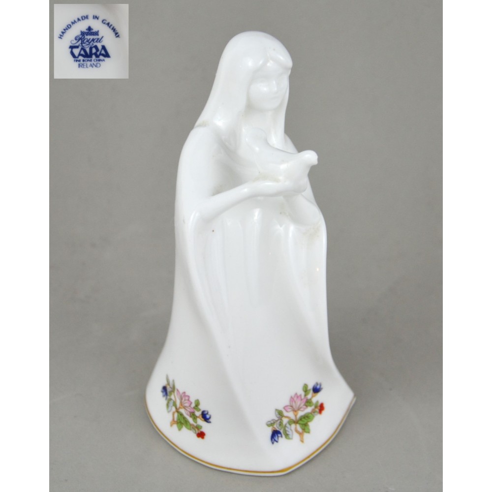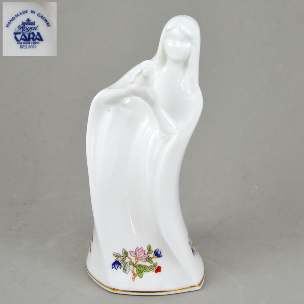 Porcelanowa figurka z kręgu kultury celtyckiej. Dziewczyna, lady z gołębiem pokoju, wyrób renomowanej irlandzkiej manufaktury Royal Tara z Galway. Postać o abstrakcyjno - organicznych kształtach z białej porcelany, ozdobiona delikatnym motywem kwiatowym. Wysokość 16 cm. Stan bardzo dobry.