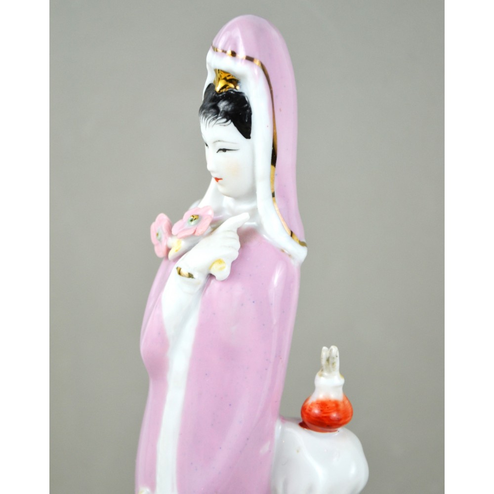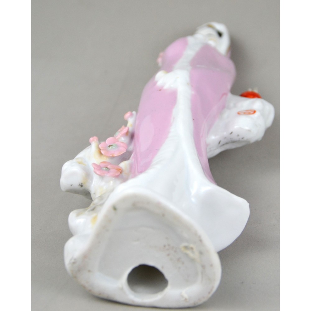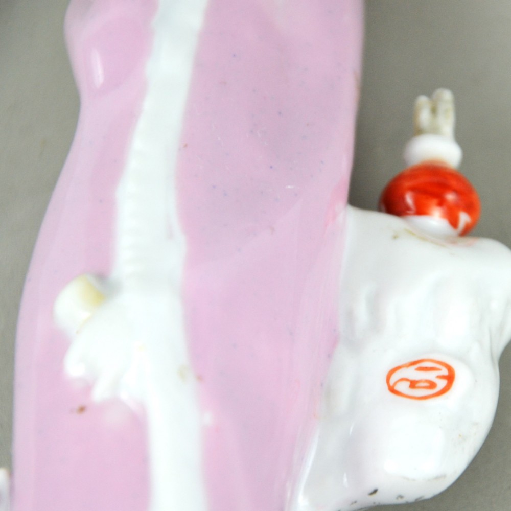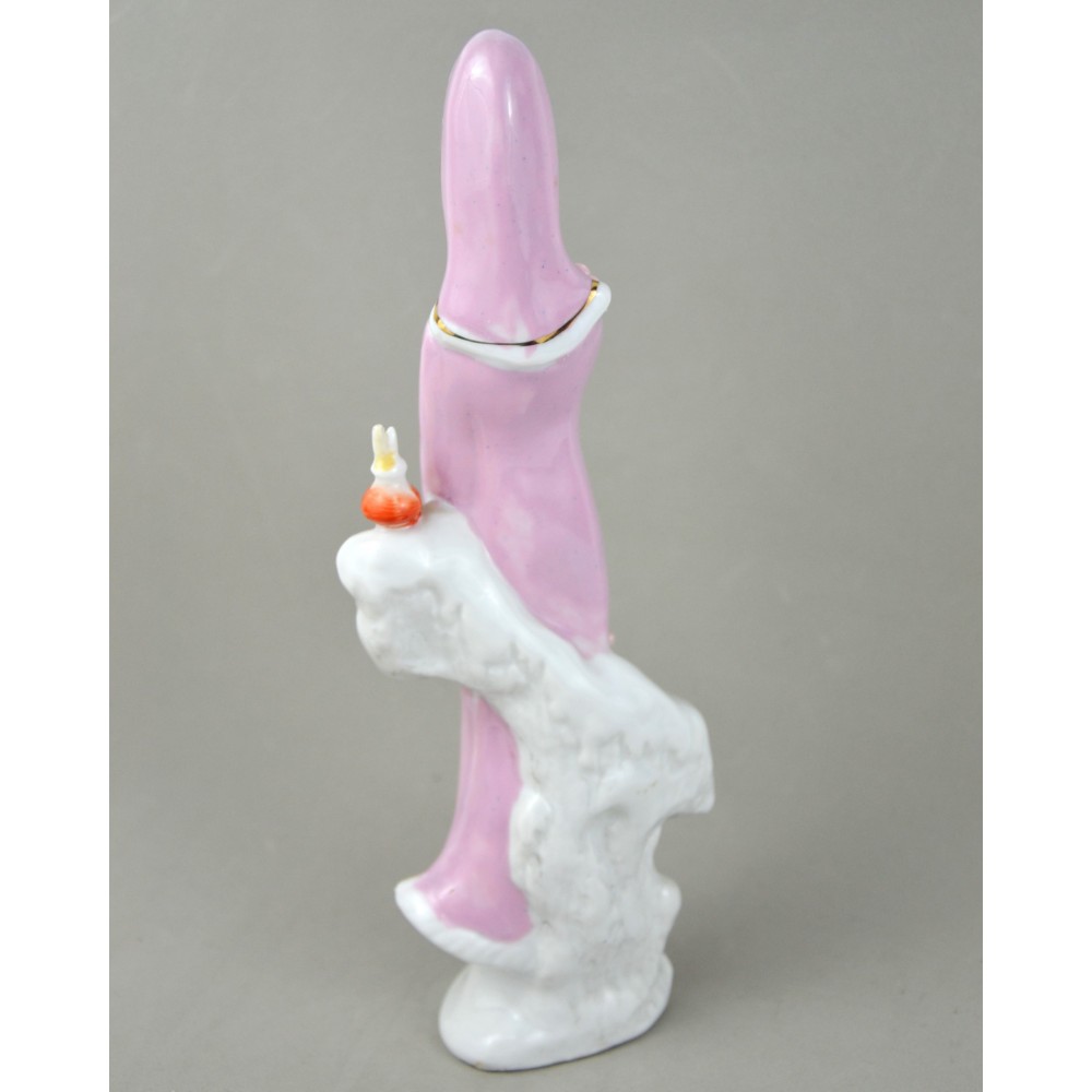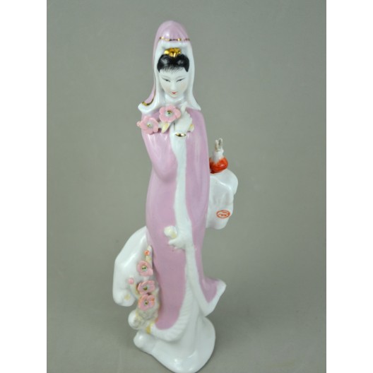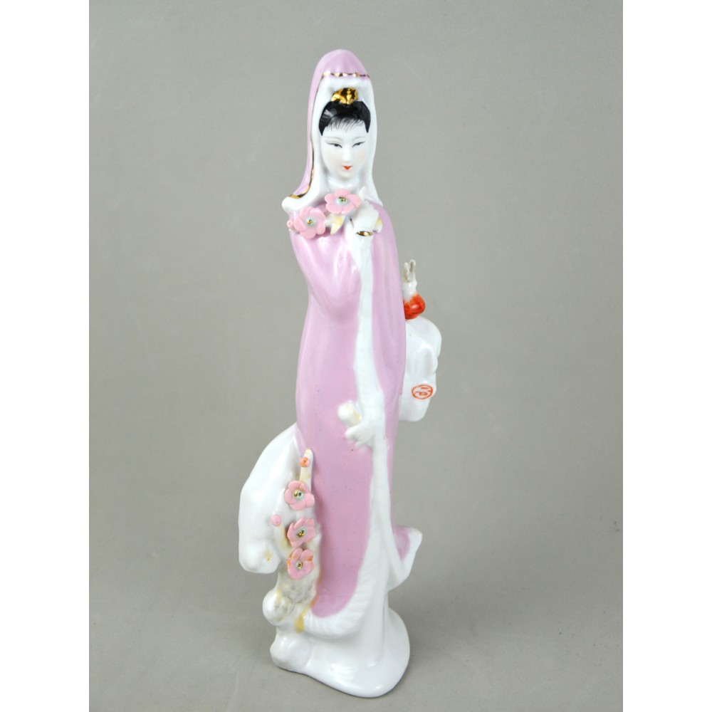 Porcelanowa figurka z kręgu kultury Dalekiego Wschodu. Młoda kobieta gejsza, Japonka w długim różowym płaszczu, sukin trzyma w ręku gałązkę z kwiatami kwitnącej wiśni. Bardzo ładna wydłużona forma, twarz wypracowana o charakterystycznych rysach podkreślona śnieżnobiałą nieszkliwioną porcelaną, reszta figurki skliwiona Brak sygnatur , jedynie niezidentyfikowany czerwony znaczek. Wysokość 26,5 cm