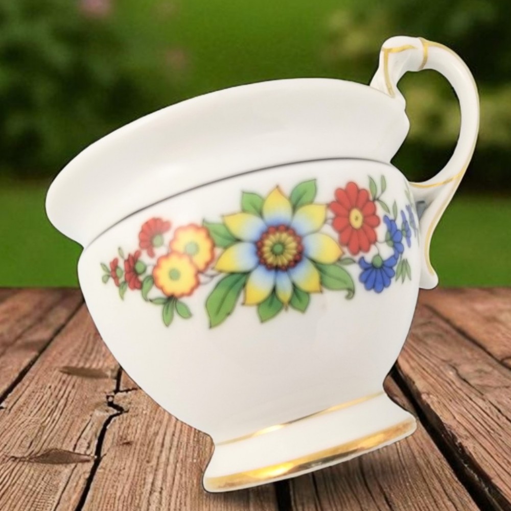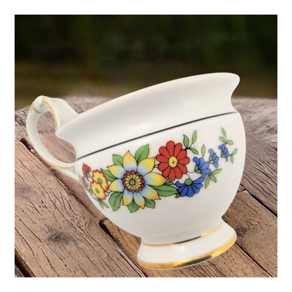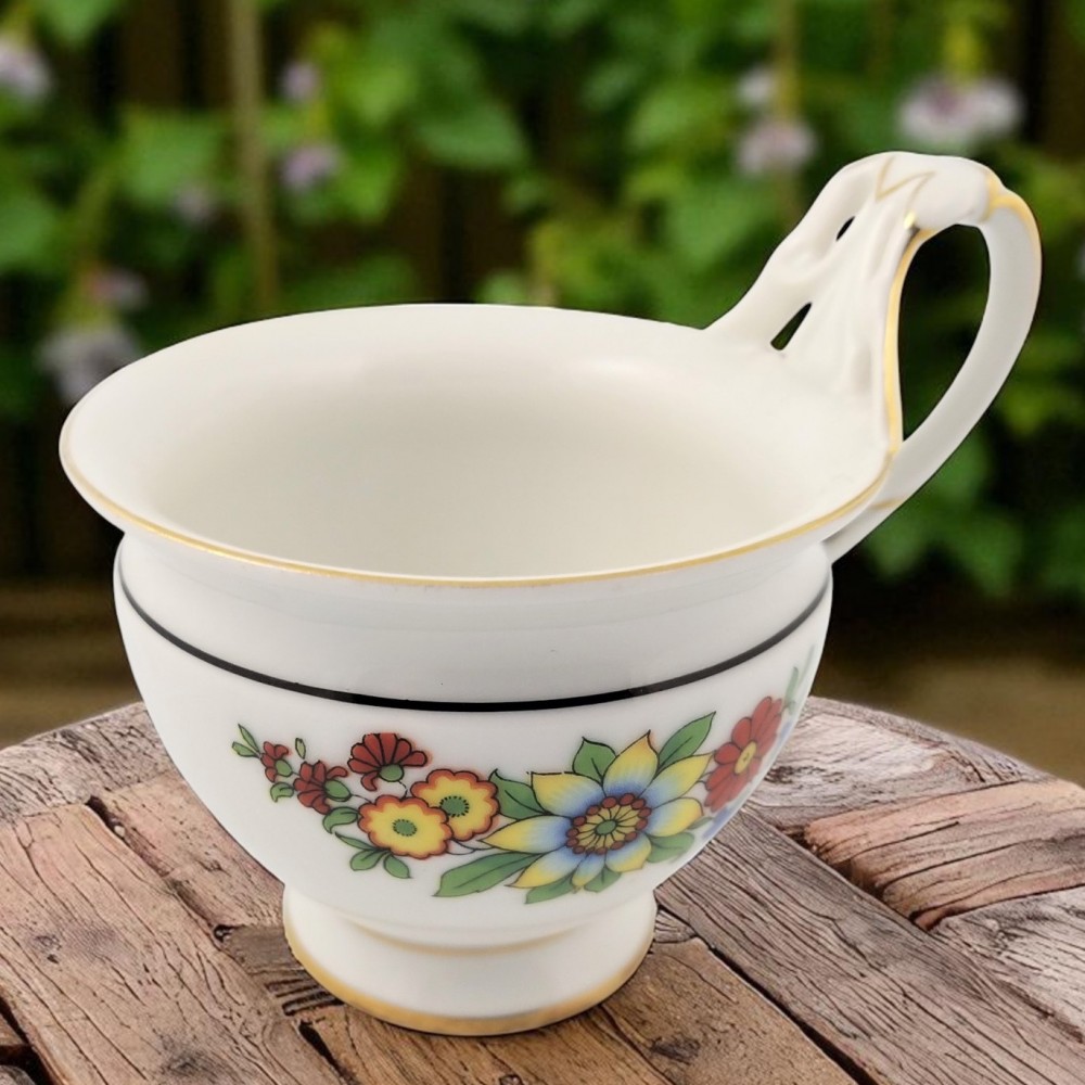 Kolekcjonerska filiżanka do gorącej czekolady sygnowana Weimar lata 1848/1933 Blankenhainer Porzellanfabrik w Turyngii .Garnuszkowa forma wypukła w środkowej części, zwężona przy podstawie i na górze pod wywiniętą na zewnątrz krawędzią, uszko dekoracyjne, finezyjnie wyprofilowane, wyciągnięte wysoko ponad rant filiżanki. Biała porcelana zdobiona motywem kwiatowym