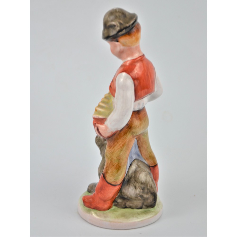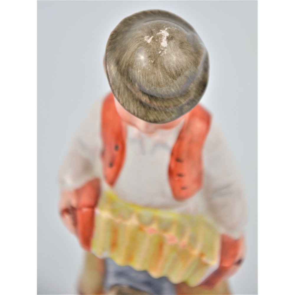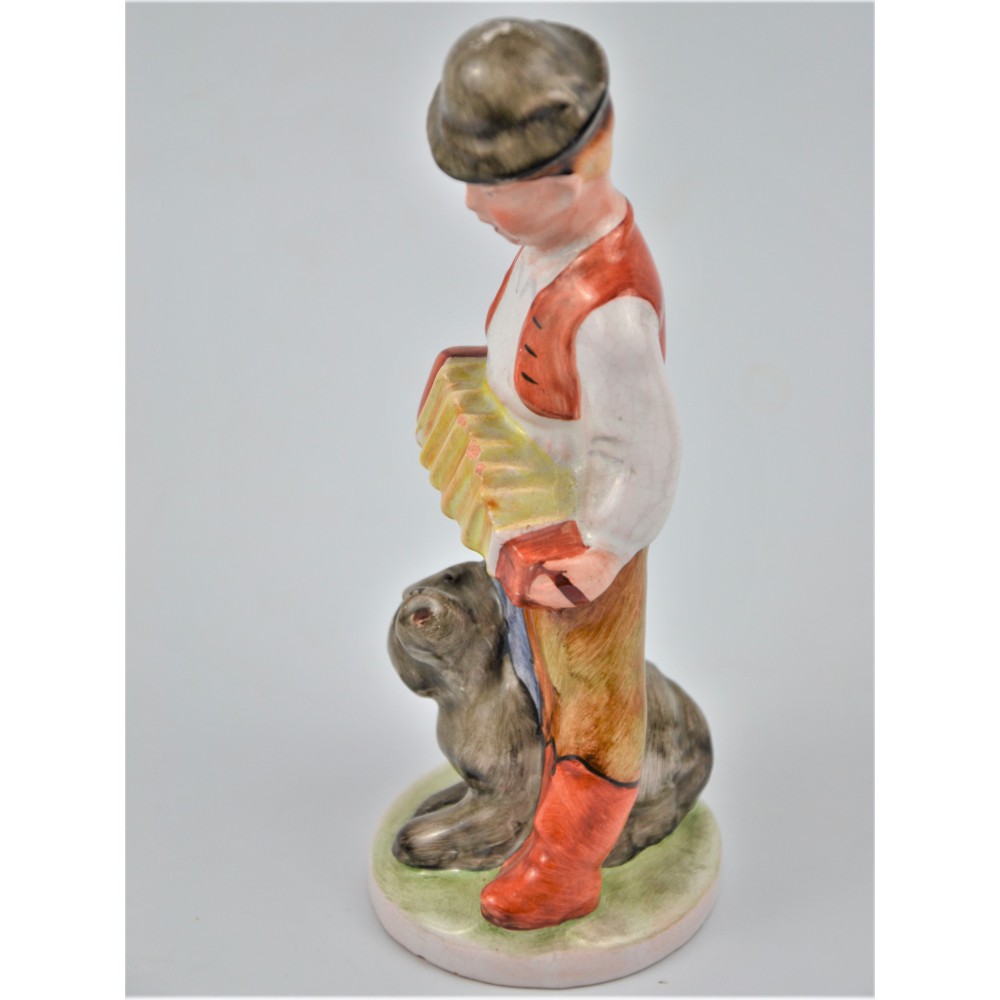 Kolekcjonerska ceramiczna figurka z lat 50/60tych chłopiec gra na harmonii, przy nim siedzi pies. Bardzo ładna forma, piękna, żywa kolorystyka, dekoracyjna, wysokiej jakości. Wyrób sygnowany Kerámia Iparművész KSz. Gratka dla kolekcjonerów figurek. Wys.19 cm podstawa 7,5/6,8cm stan bardzo dobry, niewielkie ślady użytkowania, przetarcie na czubku kapelusza.
