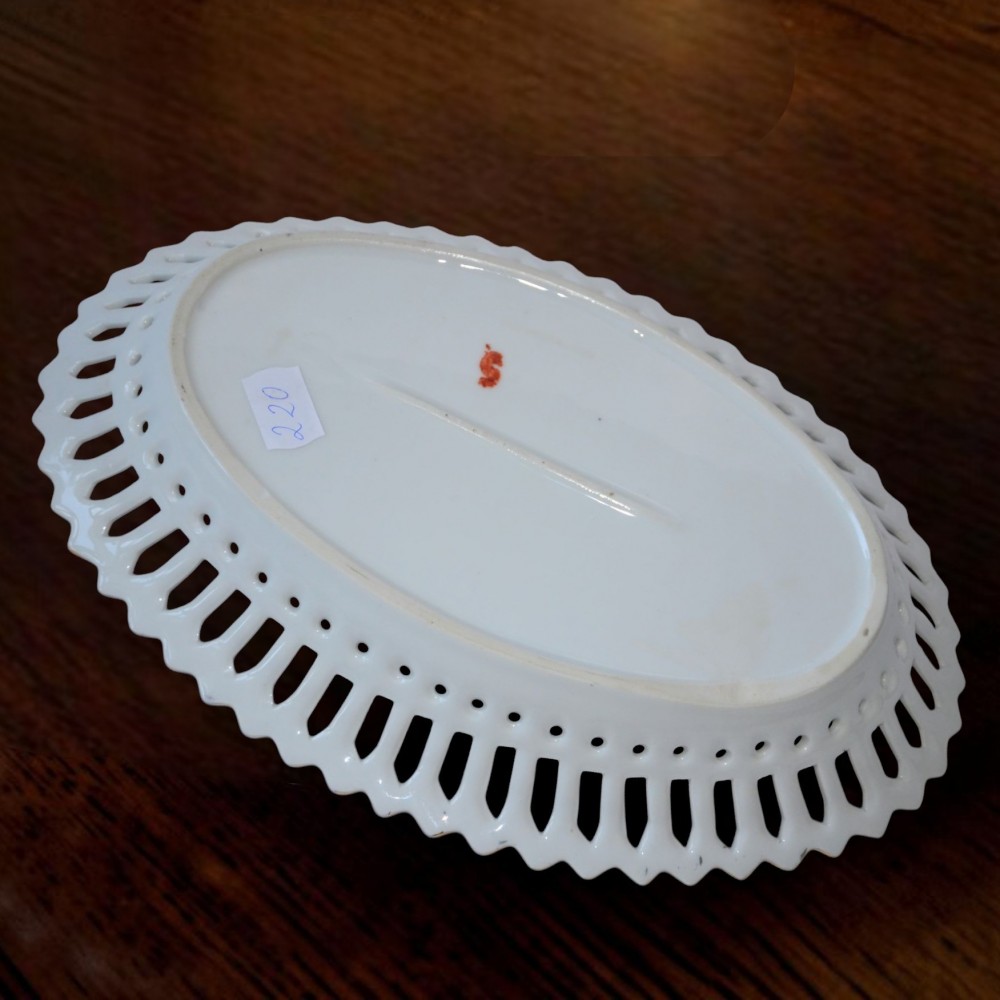 Interesujący porcelanowy koszyk, półmisek rodzaj owalnej patery, bez sygnatury. Bardzo ładna forma, kołnierz ażurowy, lustro ozdobione wzorem cebulowym w kolorze niebieskim lekko złocony. Porcelana wysokiej jakości Wymiary: 27/ 18,5 cm, wys. 4 cm.